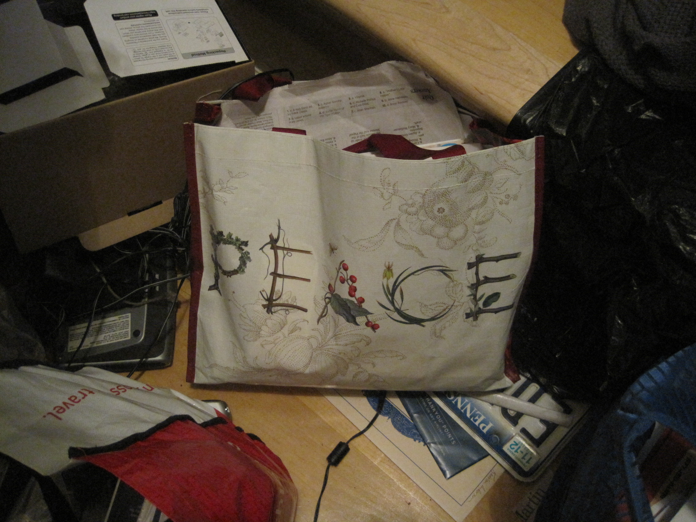 This photo was not staged, either, and shares the same funny and sad aspect. A bag (Freudian slip, I just typed gag) featuring the word PEACE, filled with mostly trash, surrounded by chaos. This is really the belly of the beast in my organizational challenge. Piles of paper that I sweep together when company is coming, telling myself I’ll retrieve and sort through them the next day … but that next day almost never comes.