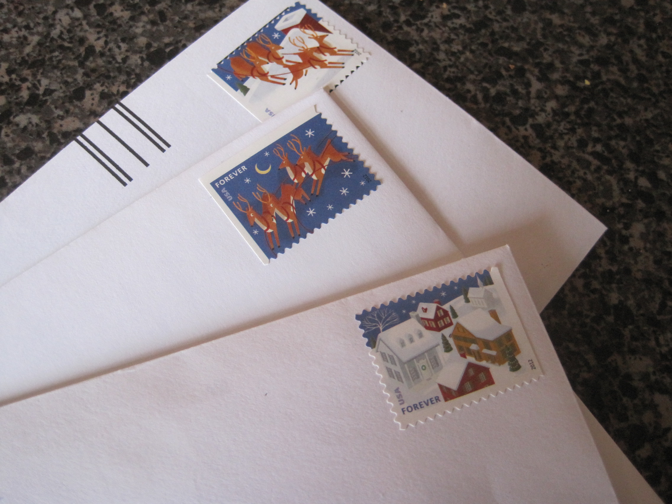 True confession. These three envelopes contain items I usually have trouble getting out in a timely manner. A condolence card, a bill, and a car registration renewal. All are easily put off, and then the power of the pile takes over.