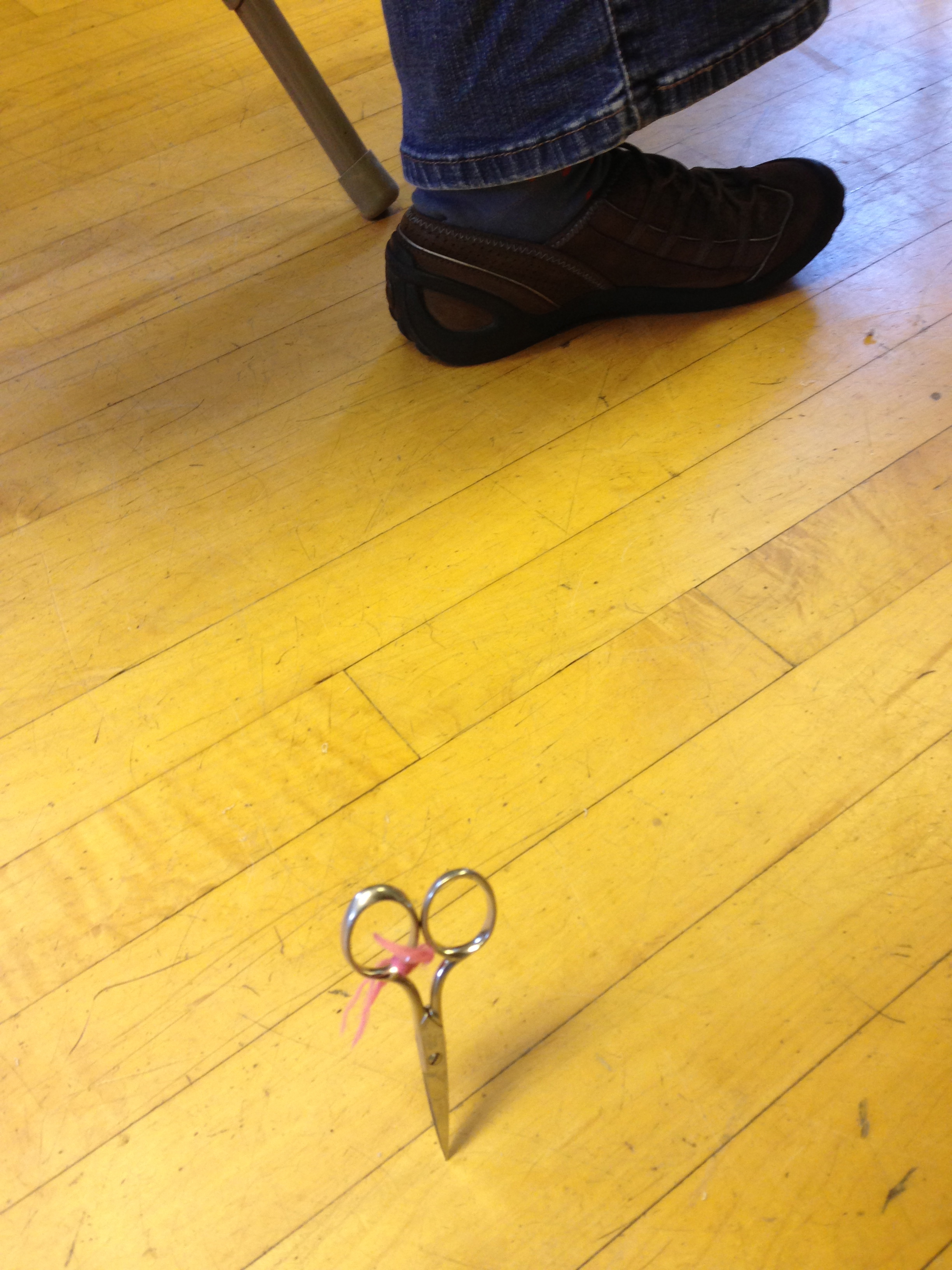 I’ve been wanting to knit socks for a long time. I belong to a loosely formed, but very loyal, group of women from our Quaker Meeting called Sewing Group. Companionship, news of the day, problem solving, and laughter knit us together (sorry, pun intended). Sewing is not required, but there are some serious needlework mavens in the group who churn out socks like nobody’s business. Intimidating. One such maven accidentally dropped her sewing scissors on the floor the other day. This is how they landed. Sewing Ninja?