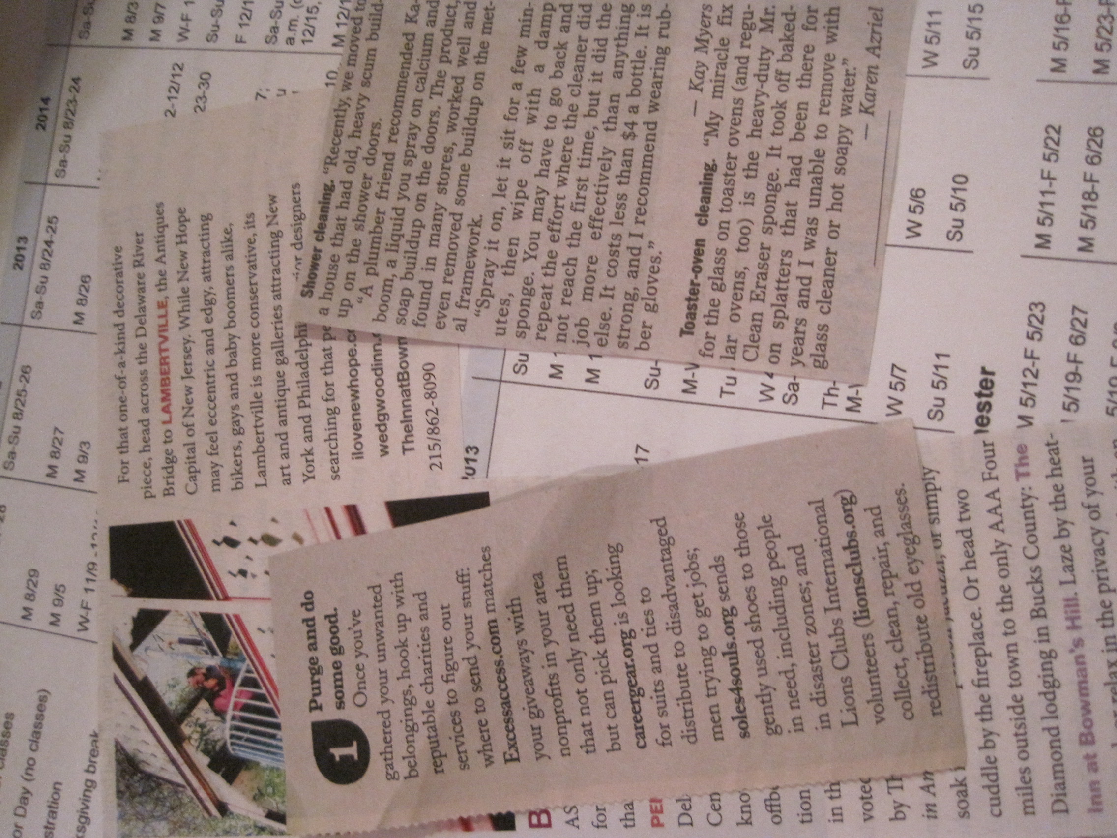 Then there are little paper clippings. I cut them out for a reason. Some can be filed. Others discarded. The little ones can be written out or taped in a small notebook I keep for writing down ideas. Here’s one example: a “miracle fix” for the glass on toaster ovens (and regular ones), is the heavy-duty Mr. Clean Eraser sponge, according to Karen Azriel, who wrote in to the Philadelphia Inquirer.