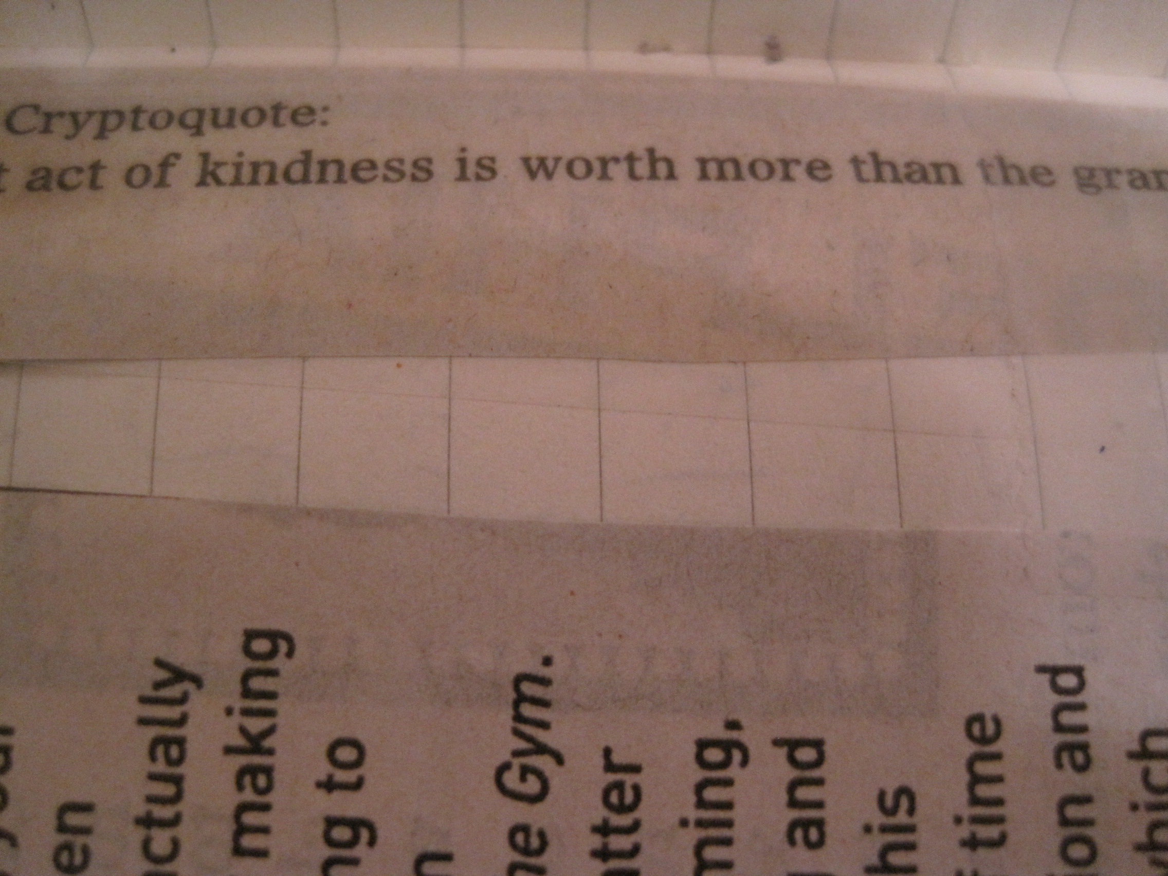 Below, a sample page with little pearls of wisdom stuck inside. From the daily Cryptoquote puzzle: “The smallest act of kindness is worth more than the greatest intention.” –Oscar Wilde (See unsent greeting cards, above.)