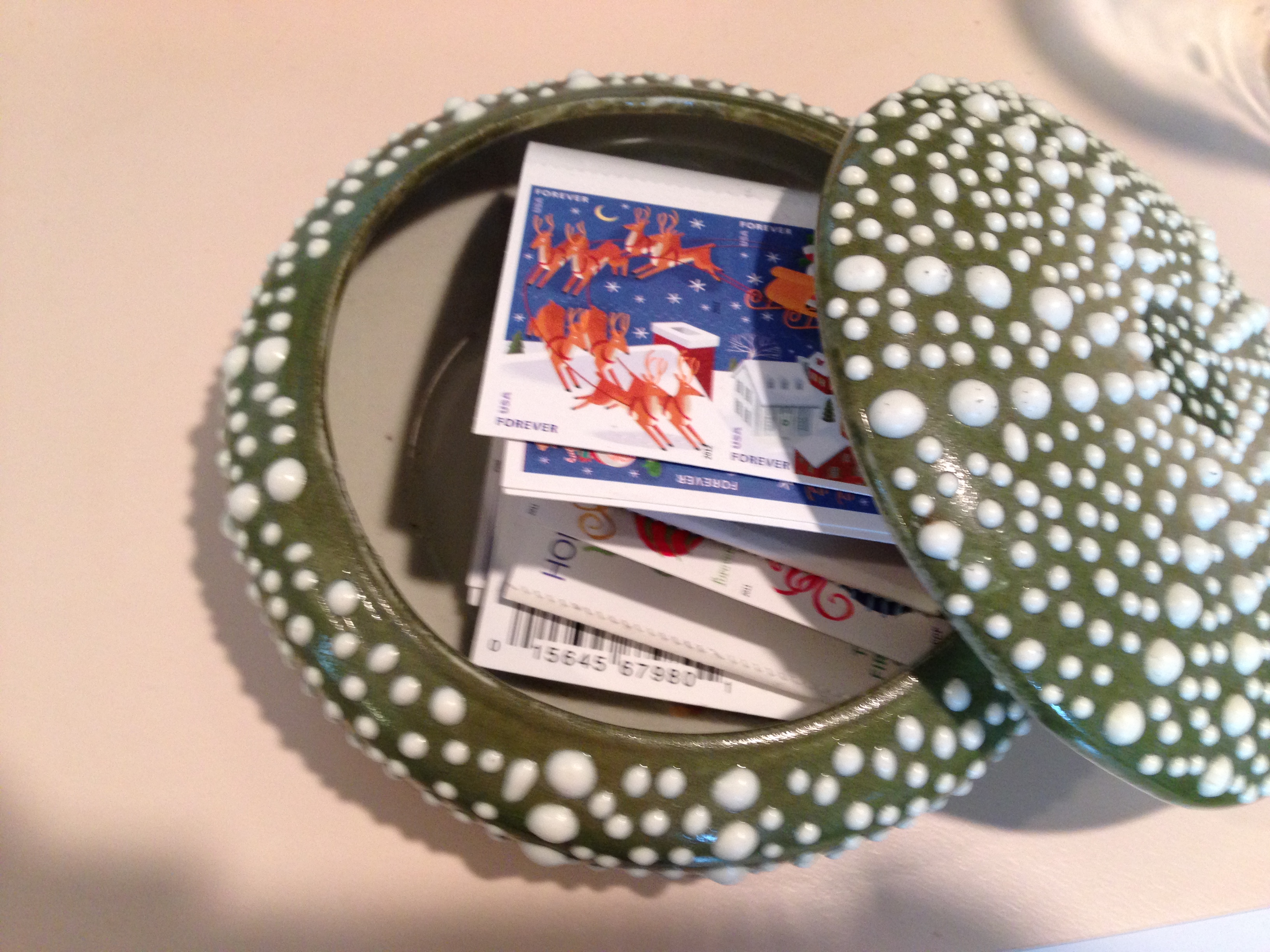 Here are stamps that weren’t appropriate at this late date, stored in a ceramic container that makes me smile when I think of its origin. Several years ago we were shopping while on vacation at the shore. I scooped this up with a book on Clutter Busting. My husband saw what I was buying and gave me a stern, raised eyebrow look. I hadn’t noticed the irony: oh yeah, how to get rid of clutter, and a piece of clutter to go with it. I made the purchase anyway and now the dish is our dedicated stamp place; a sea creature living under the kitchen wall phone. It has saved us from our old fretfully-scouring-around-for-stamps routine. Also, it reminds me of the beach and is a delight to handle (reflexology for the fingers?). Lesson learned: not all pieces of clutter are created equal, unlike people.