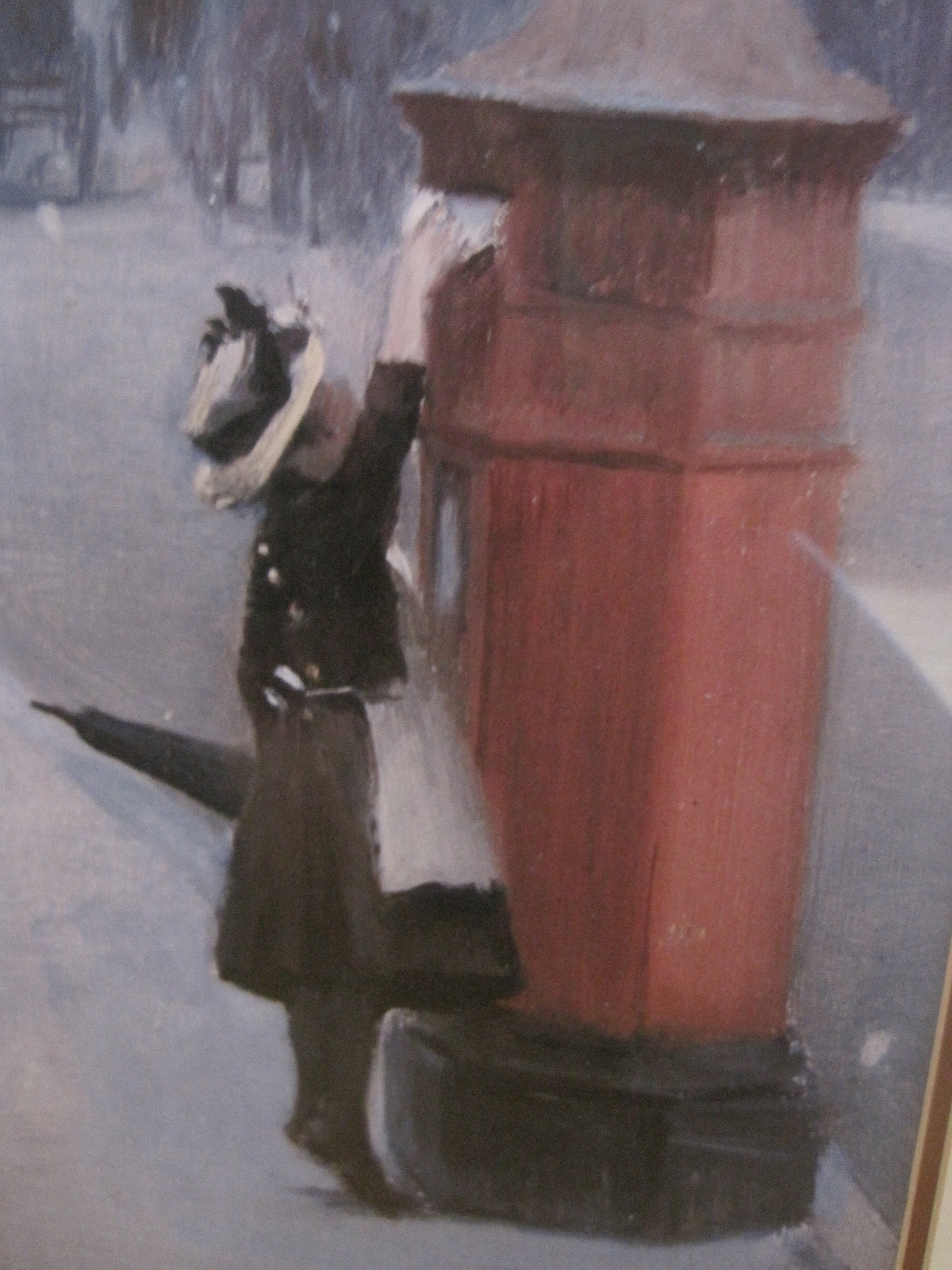 Apologies to Dr. King for the title of this post, but Thank God Almighty, the card of 2012/13 finally got into the mailbox. In keeping with a series of unfortunate events at every stage, I tried to take a photo of the cards entering the mailbox, but realized the camera battery was charging at home. I tried again with my cell phone, not aware it was set on video. I will not subject you to that scintillating footage! Here is a visual approximation, below, a print I’ve always loved (artist unknown). It captures the exhilaration of sending something out into the world. And what a great hat!