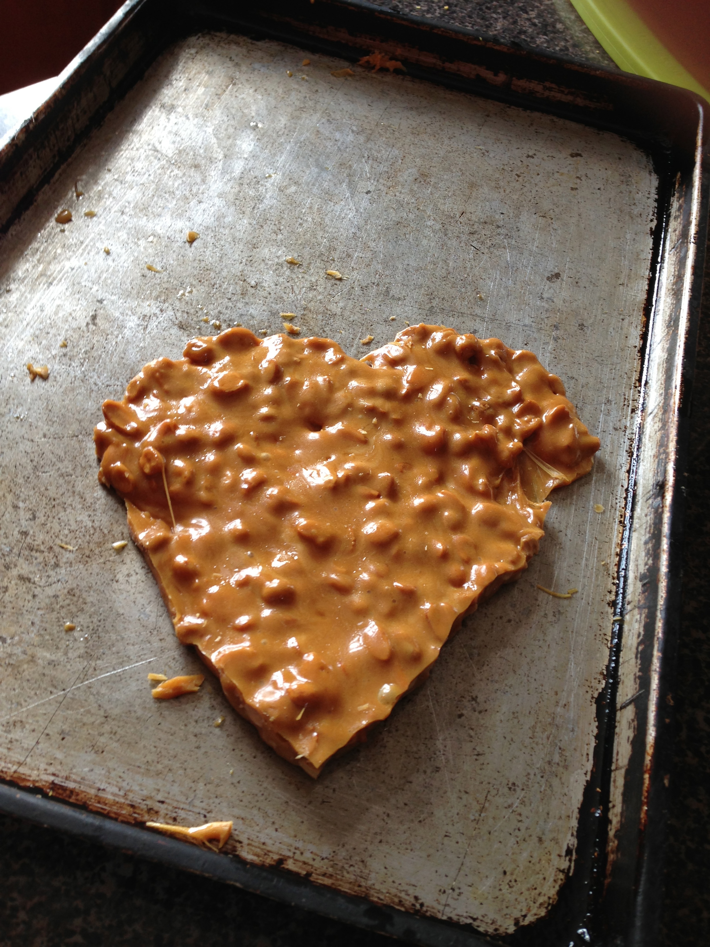 A peanut brittle-heart my husband inadvertently fashioned while making the wonderful treat for a friend.  He hadn’t seen it; I had to stop him to snap the photo.