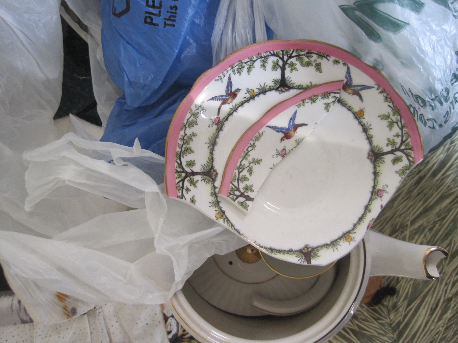 Here’s a good example.  These bags are filled with pieces of broken china and pottery I can’t bear to part with.  I mentioned previously the very disruptive water damage repair project that left us reeling.  A lot was broken.  These shards represent dread, not wanting to revisit the sadness, and also fear of the unknown (see below).