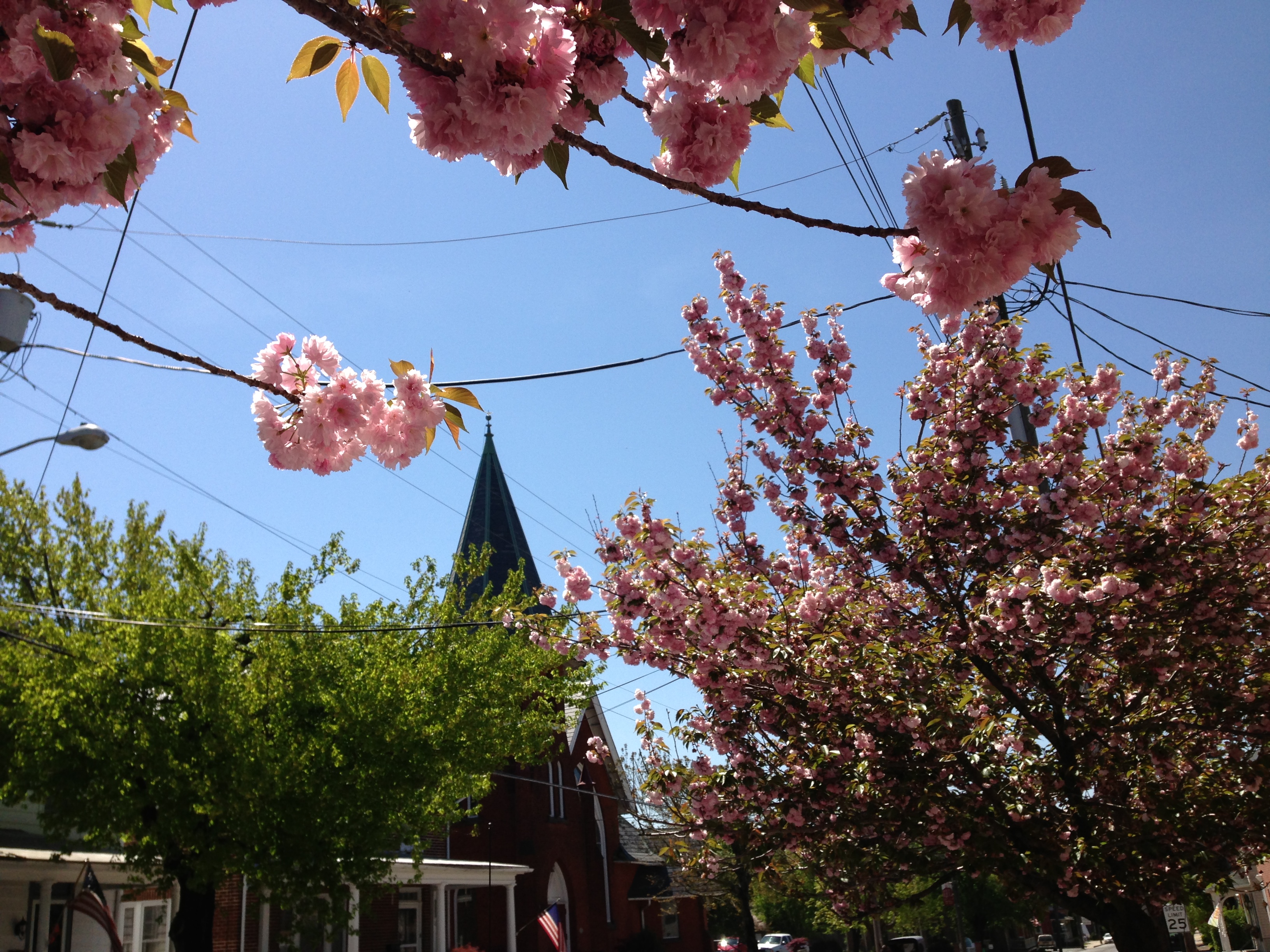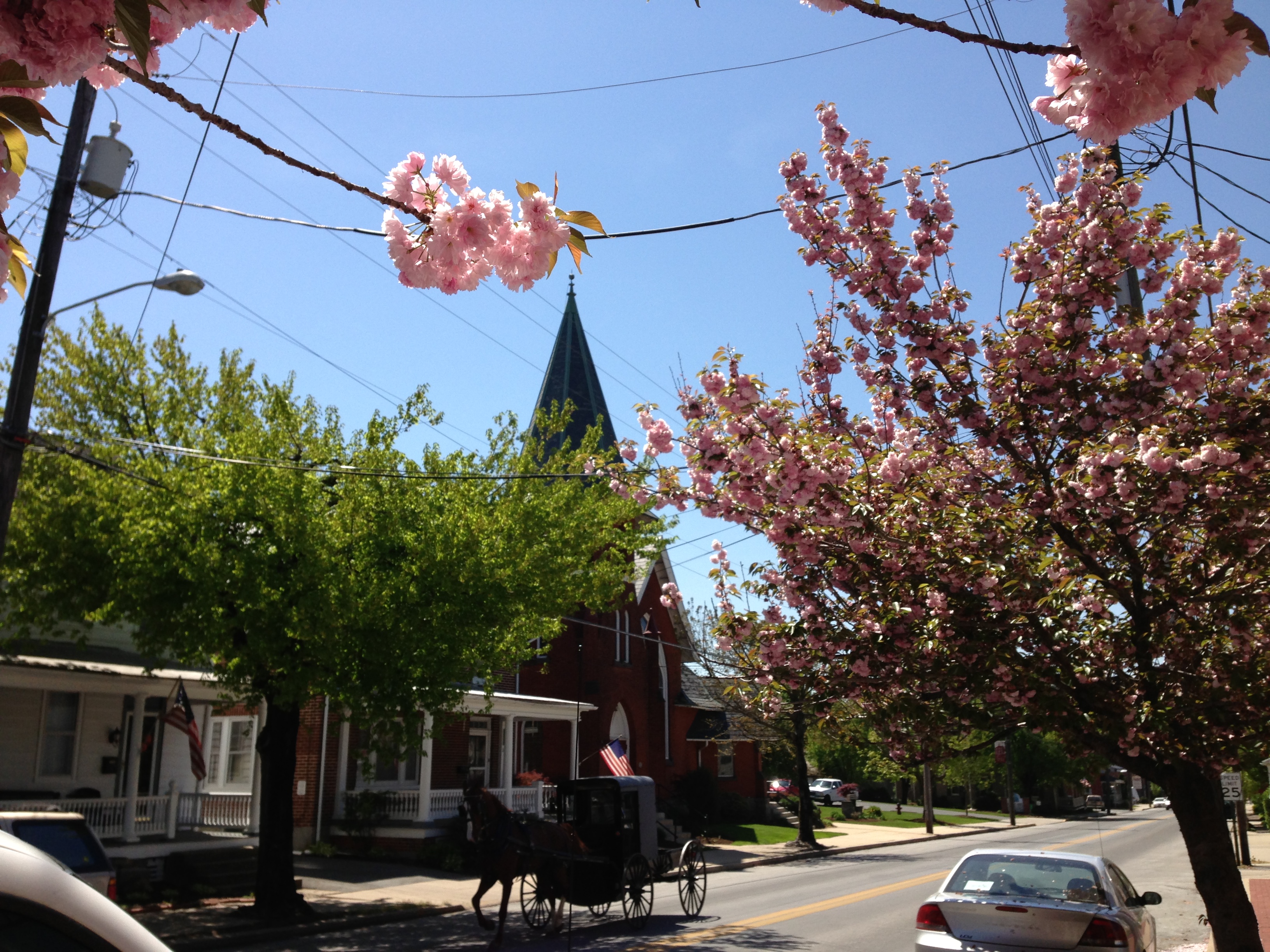 Now for prettier pictures. My mother lives in a retirement community in Lancaster County, PA, an area home to many Amish and Mennonite people. I took this photo in the town of Strasburg earlier this year when the trees there looked like garlands of pink popcorn balls strung over the street.