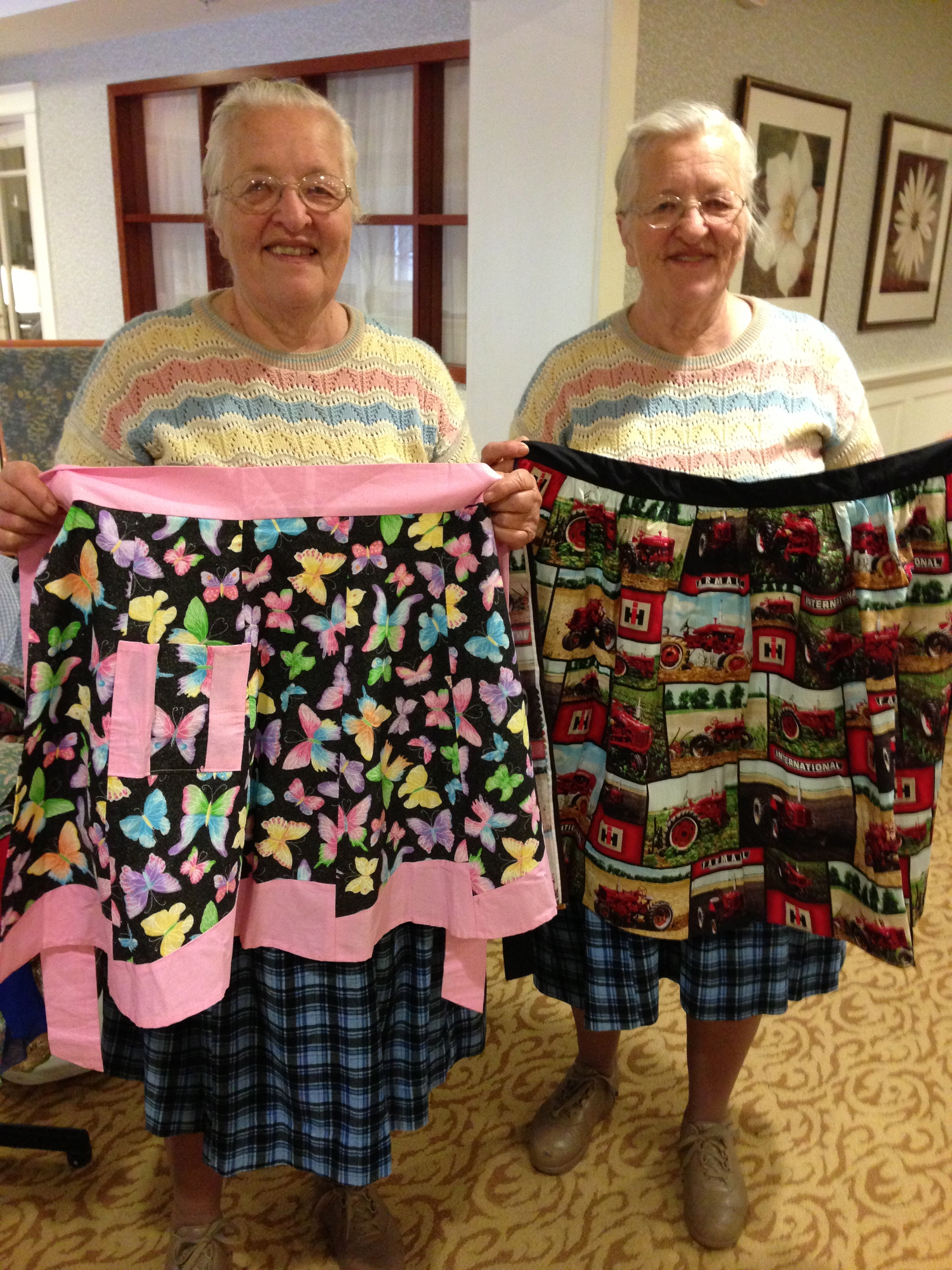 On a more recent visit, I couldn’t find my mom in her room or in any of the common areas. One of the aides told me, “She’s upstairs — the twins are here with their aprons.” Huh?? I went upstairs to find her in a group of residents listening to, indeed, two identical Mennonite ladies, dressed the same, and passing around a collection of aprons.