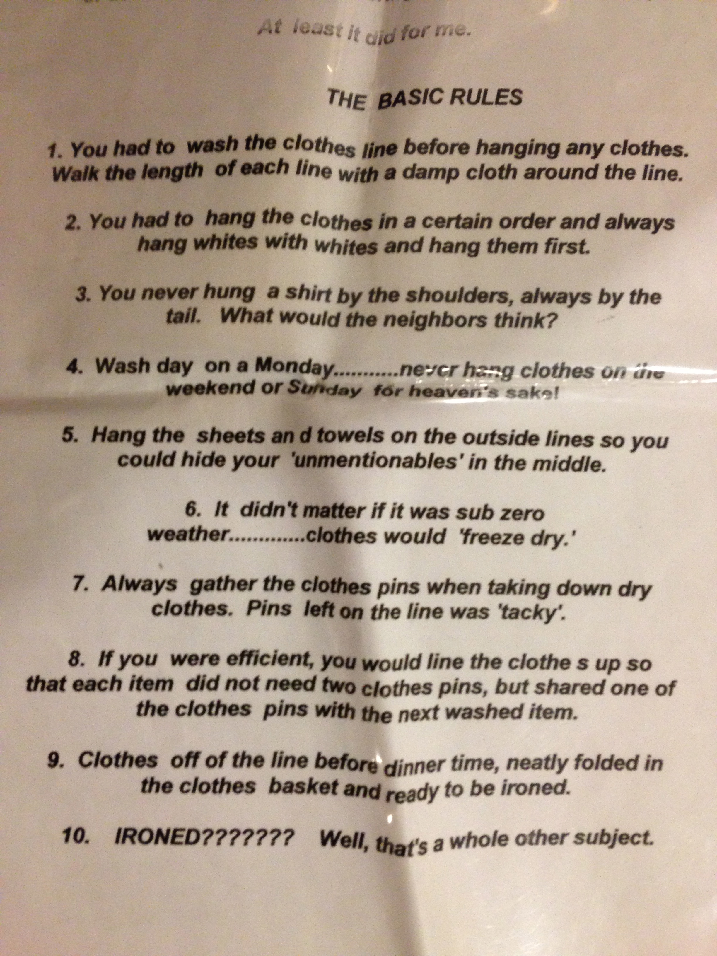 IRONED??????? There it was again. And all the laundry-hanging rules in past-tense.