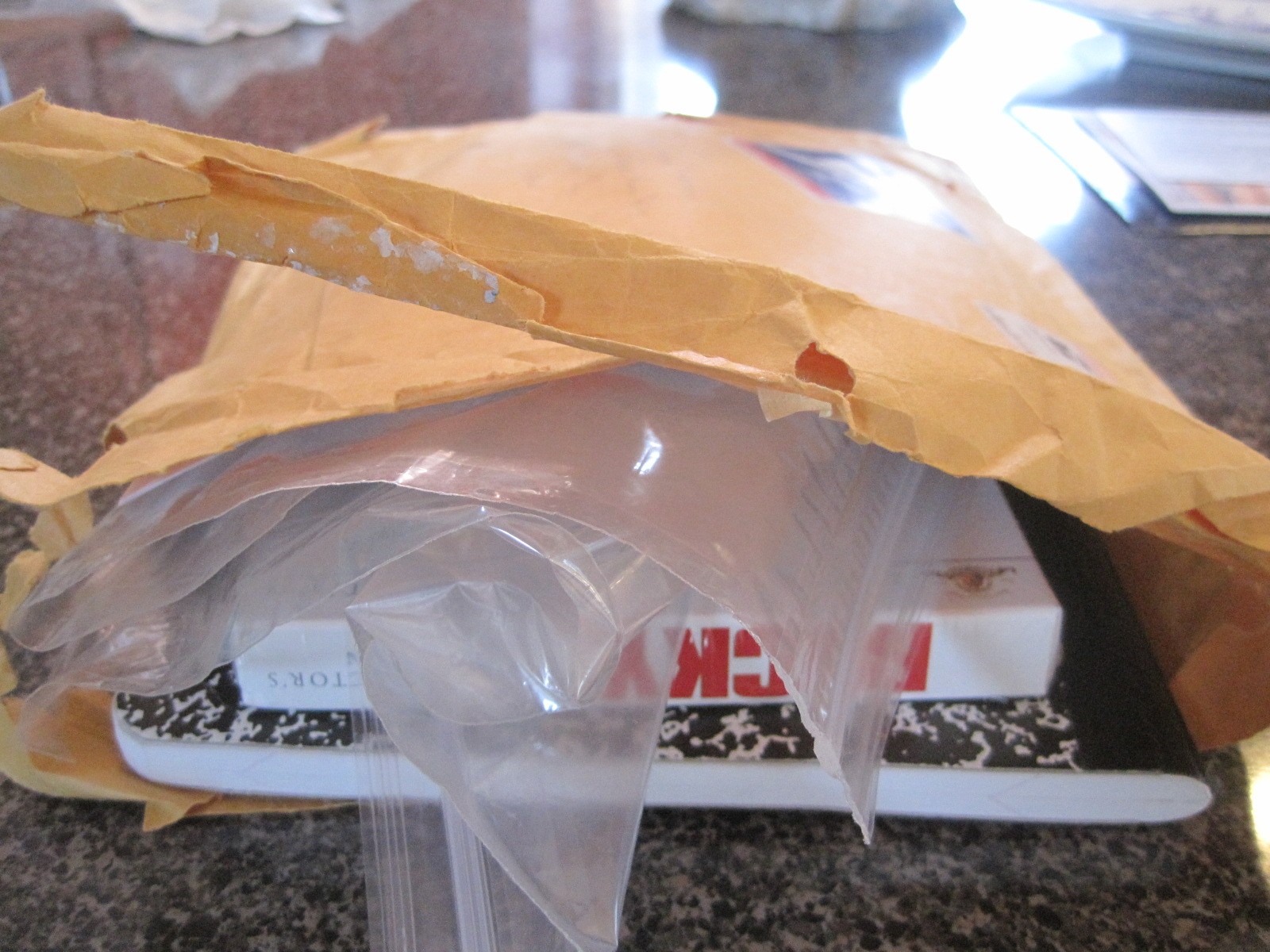 It’s a school project from a, then, nine-year old boy. He sent it to my older sister. Each recipient was to write something in his composition book about themselves and where they live, place a souvenir to represent their state in the envelope, and send it along to another person in another state. Fun. My two sisters contributed to it, as did my mom, who sent it to me. And then in the middle of moving … I lost it in the shuffle. Oh, the terrible guilt and self-loathing. By the time I found it, that school year was way, way over.