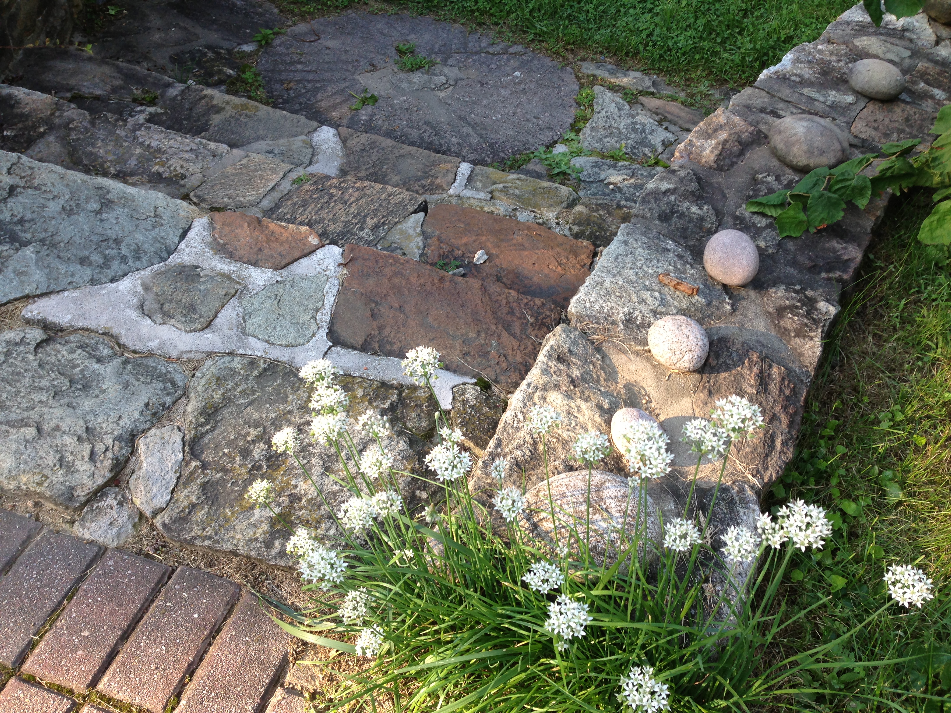I was going over to a friend’s house today and thinking of the phrase “nose to the grindstone.” It’s how you get to feel in September. The back-to-school imperative. And I realized I was walking over a grindstone, or millstone, at the bottom of their stairway. I love this stairway: