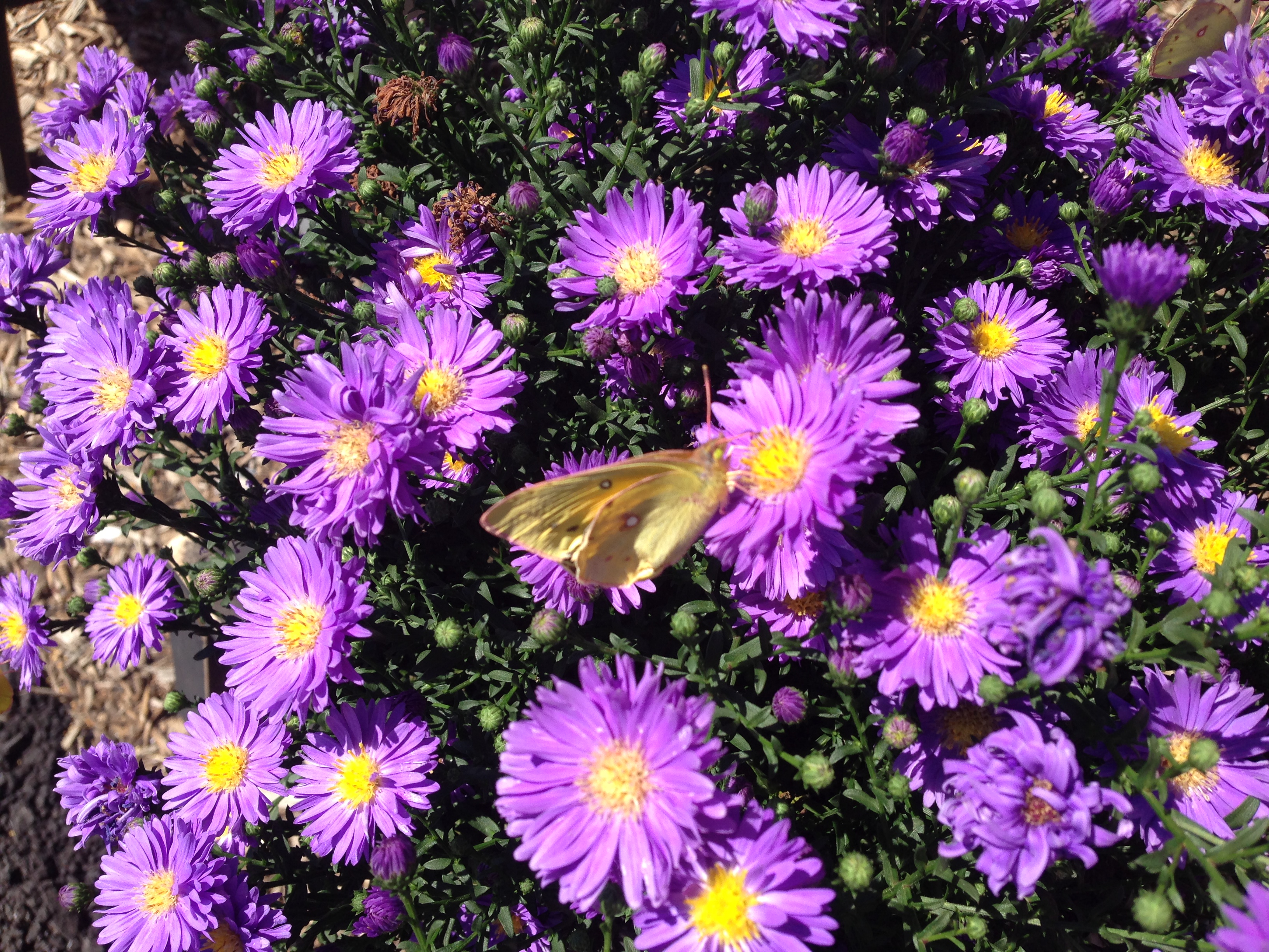 This plant was at an Amish farm stand where I stopped today on the way home from visiting my mother. Multiply the one pictured by about ten — yellow butterflies were fluttering all over it, as if the flower centers offered secret messages for yellow-winged things: