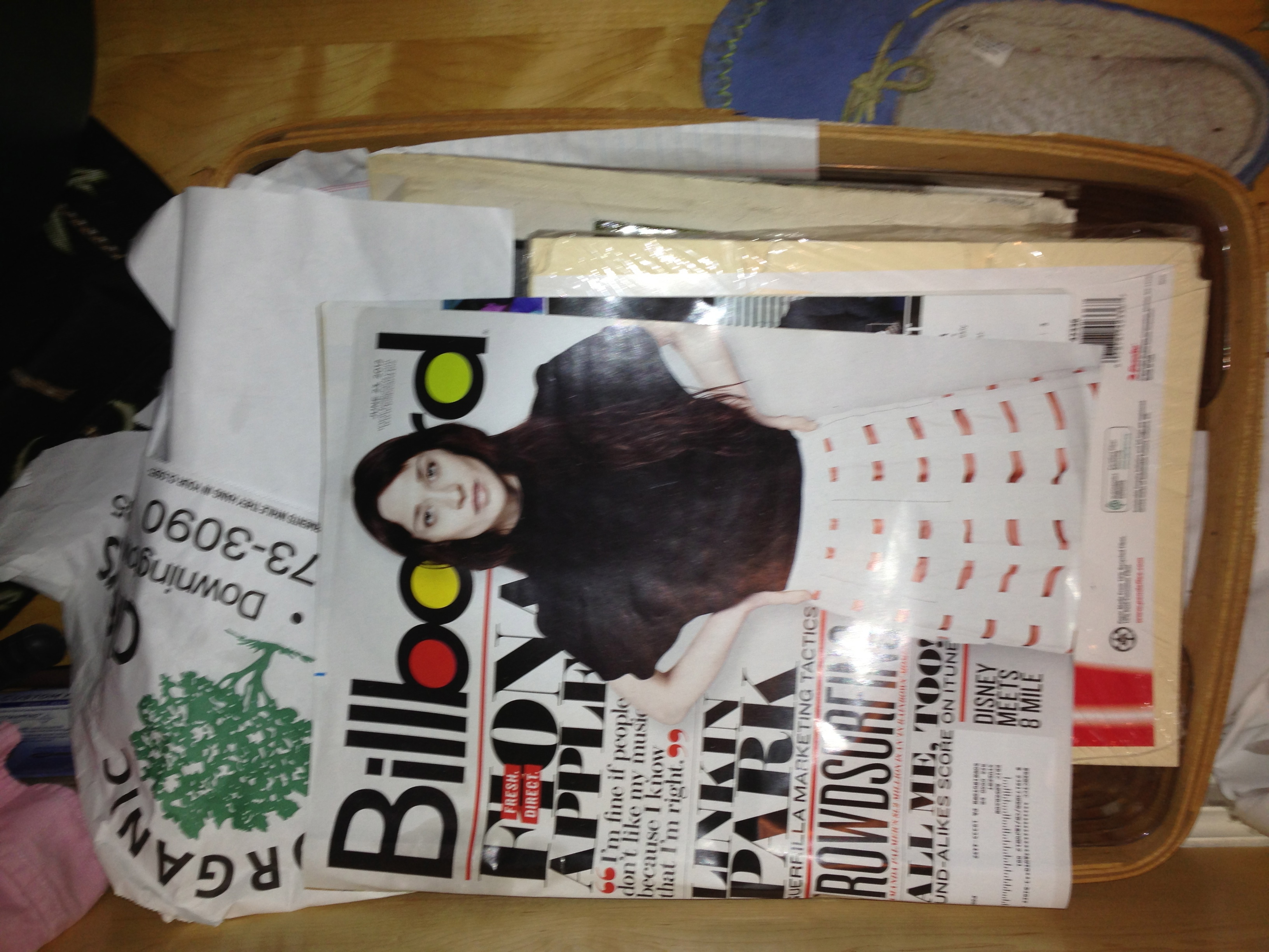 I’m sorry, Fiona Apple, neither you nor I deserve this. A basket of random clutter, swept together into the closet when company was on its way and long neglected. My son subscribed to Billboard magazine, and this copy happened to be stuck on top. Dated June 23, 2012. Hey, there’s my slipper, too.