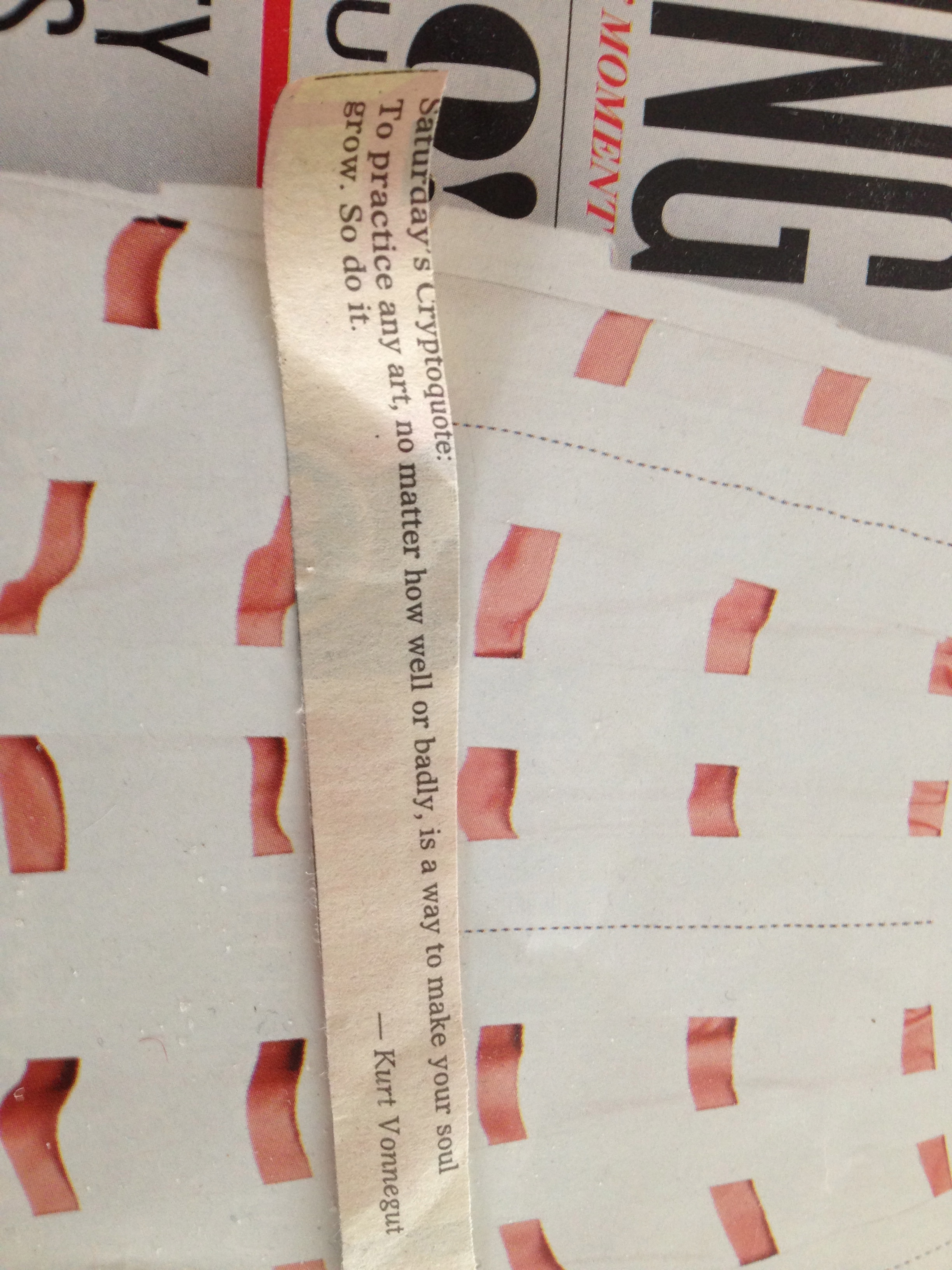 I found this clipping, a Cryptoquote, in the pile: “To practice any art, no matter how well or badly, is a way to make your soul grow. So do it.” –Kurt Vonnegut I taped it in my little book of ideas and inspirations.
