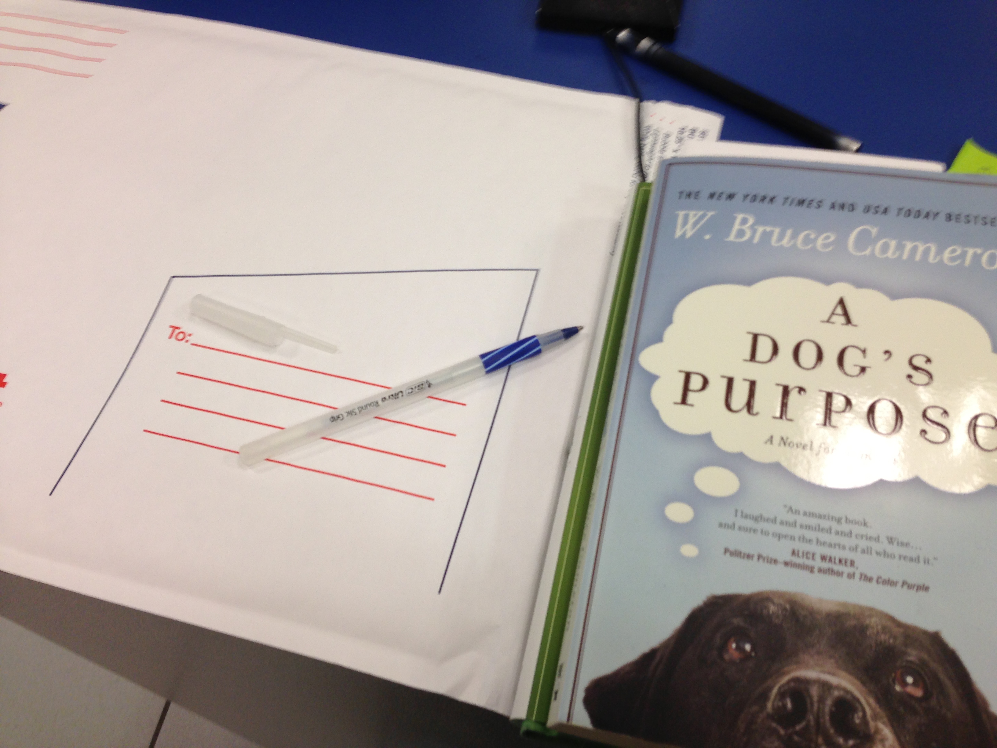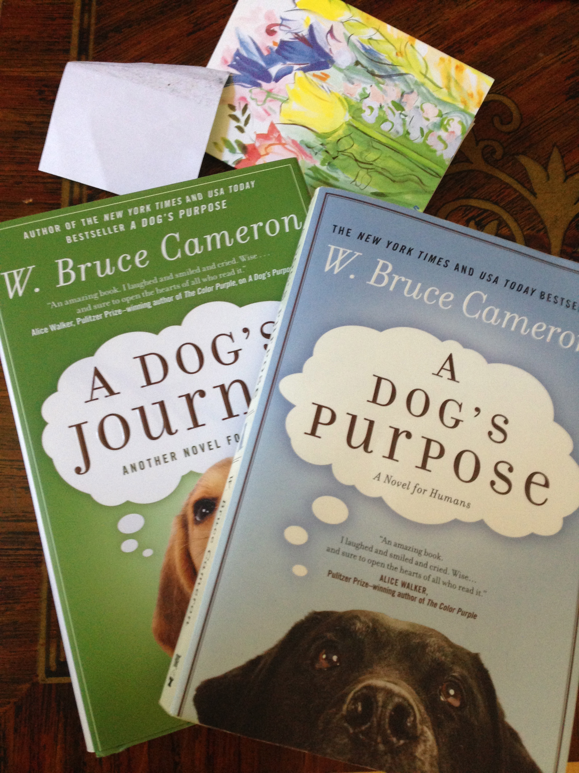 One little paper (top left in photo below) had the address scribbled on it of a friend who had loaned me the book A Dog’s Purpose, by Bruce Cameron, long, too long ago.  It was a funny and touching story told from a dog’s perspective.