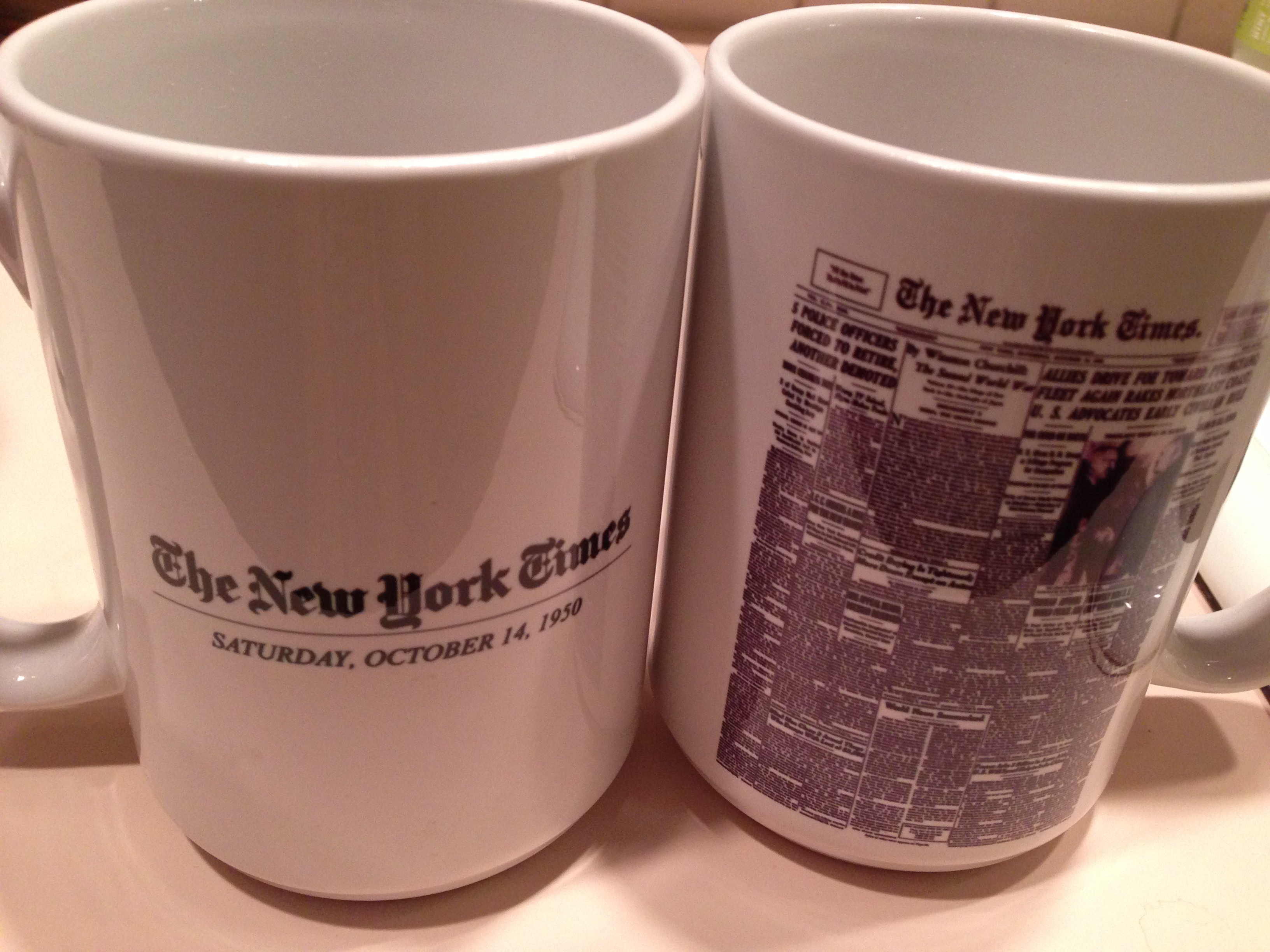 These mugs were in the medium category of difficulty for giving away. I had bought them for my parents to celebrate their 60th wedding anniversary. This was The New York Times front page on the day they were married in 1950. Off they go.