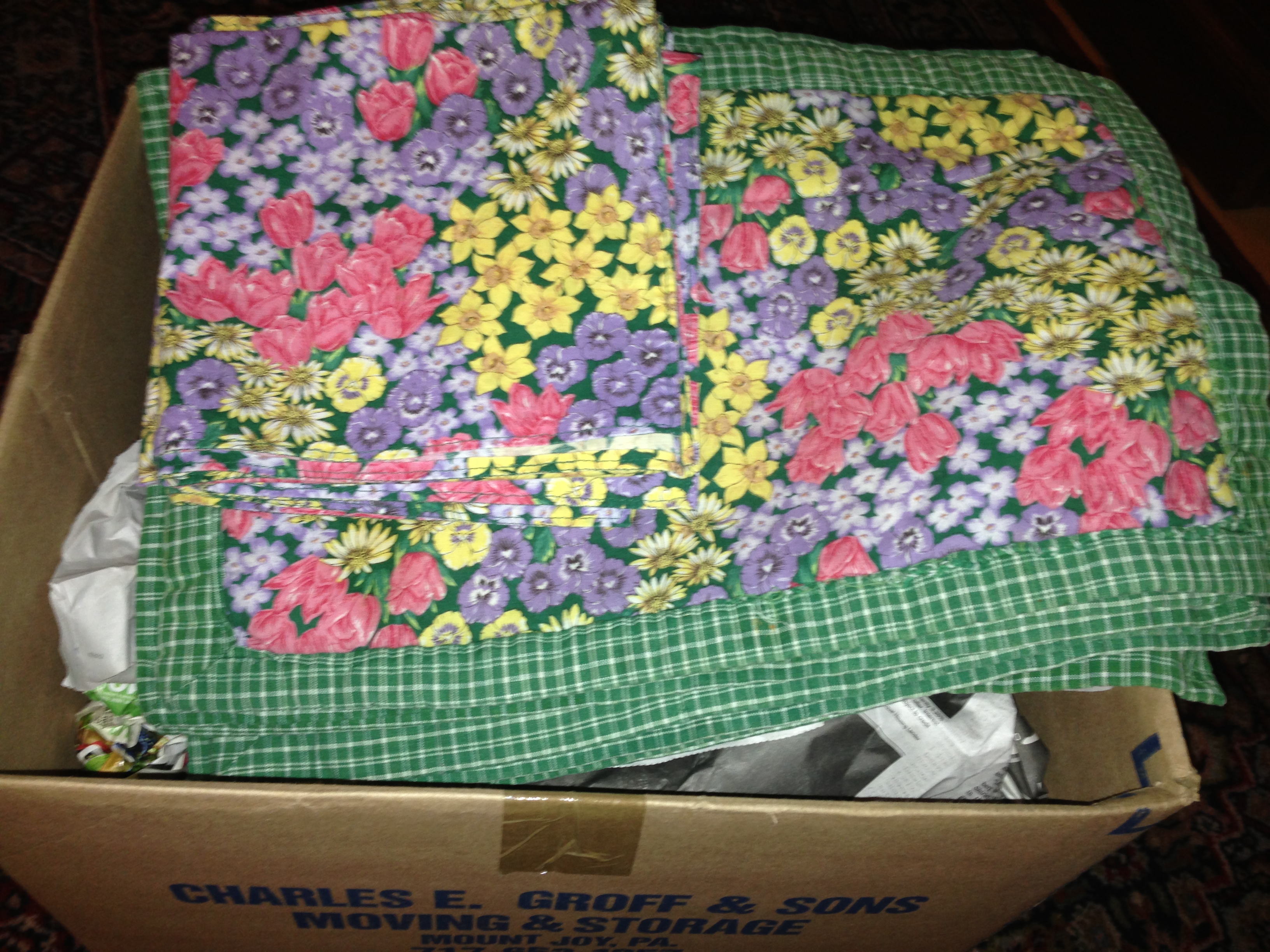 I made these place mats and napkins for my mom one Christmas. They bring back good memories of great meals at my parents’ house. When I look at them, though, I want to sew them over again and do a better job. Into the give-away box they go.