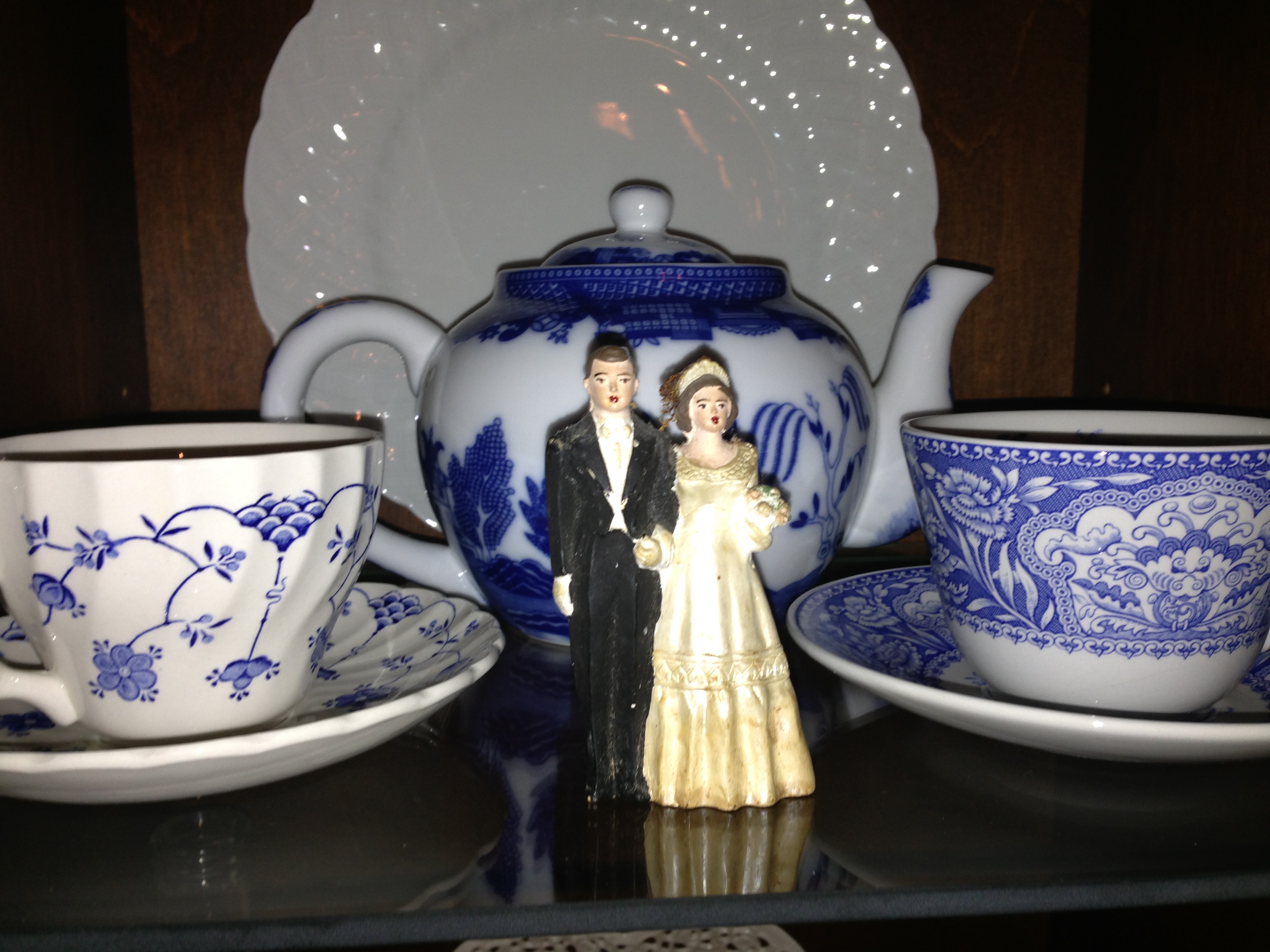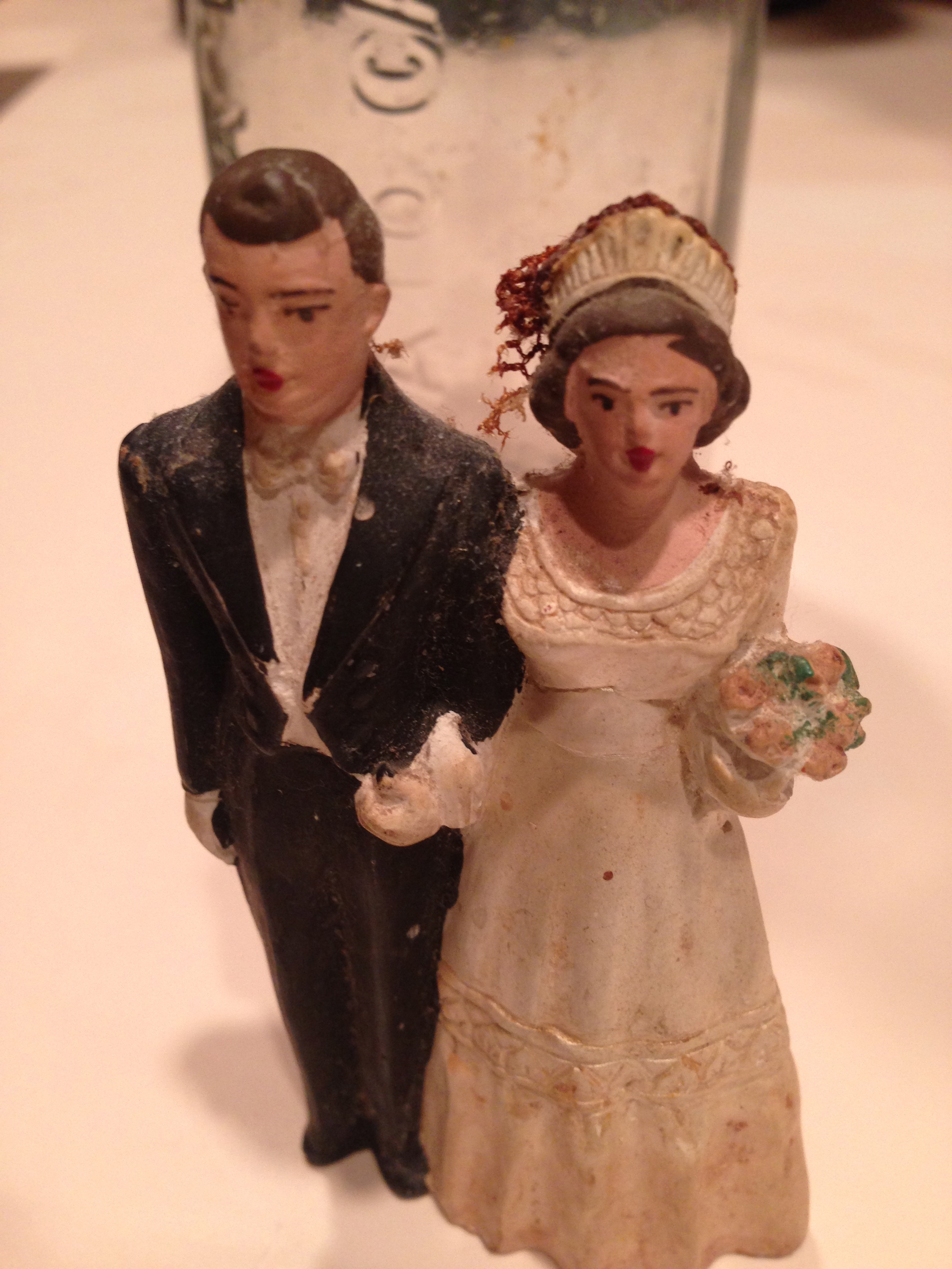 I have a new to-do list for other box contents, like checking on the value of old books, but these two items were the only clear keep-ables in the whole box: a ketchup bottle from my mother’s family’s ketchup business and the wedding topper from my parents’ wedding cake. What a handsome couple.