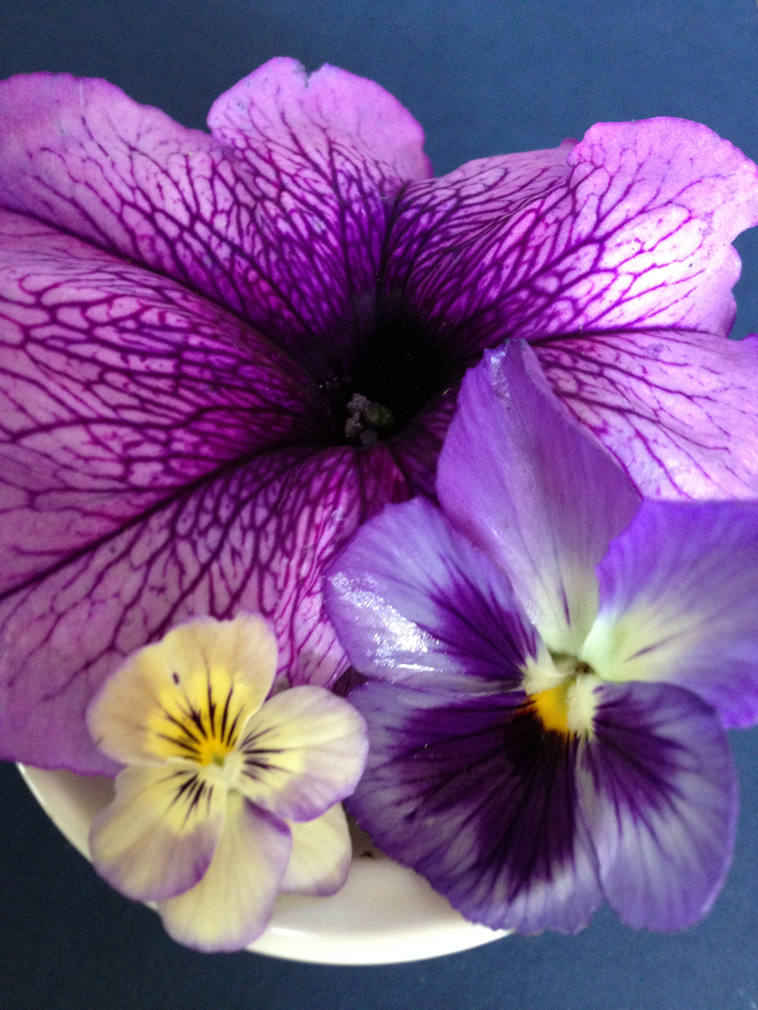 My mom’s affection for pansies must have rubbed off on me. I took this photo of two of them with a petunia during pansy season this spring. (Doesn’t the one on the right look like a cat face?)