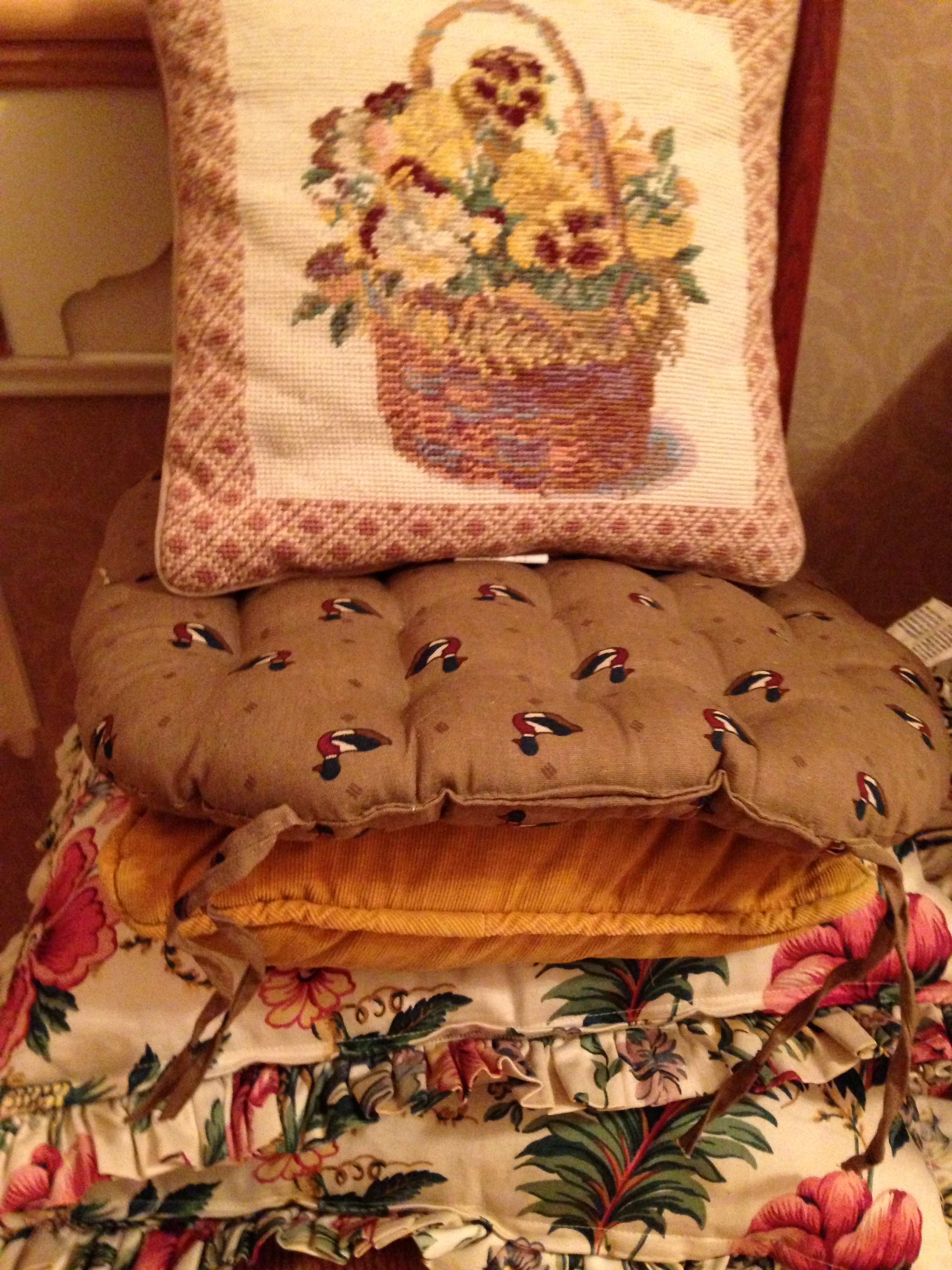 Next, I put together an assortment of pillows to give away. I’d given the one with needlepointed pansies to my mom at some point. She has always been a big fan of pansies and often remarked about how much she liked it. I will bring it back to her.