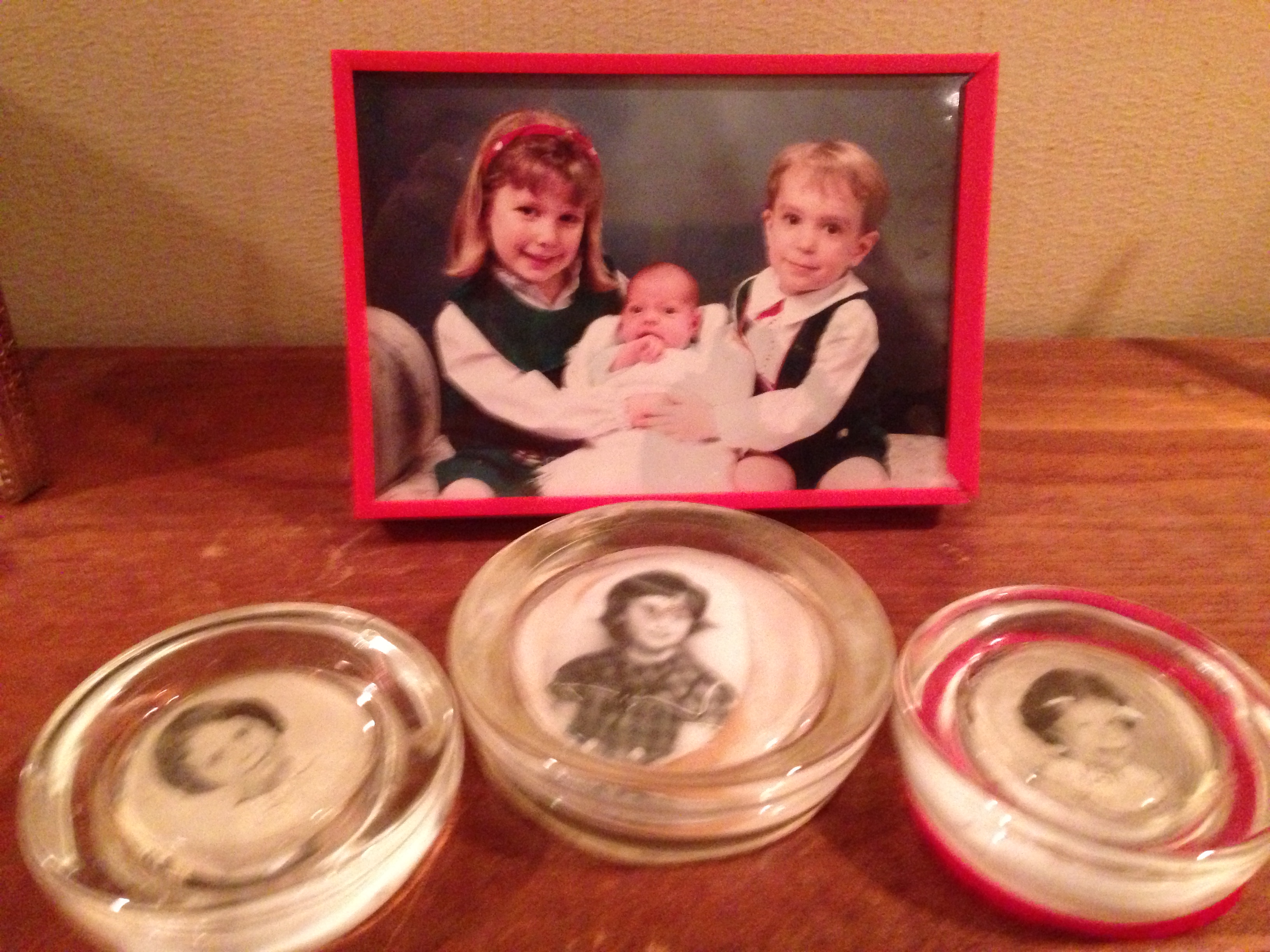 The red framed photo is from the first Christmas card my husband and I sent with three kids in it. That winter was the most severe weather I can remember. Getting the photo taken and putting the card together seemed akin to scaling Mount Everest. I believe the adorable outfits were from a very exclusive line found at a yard sale.