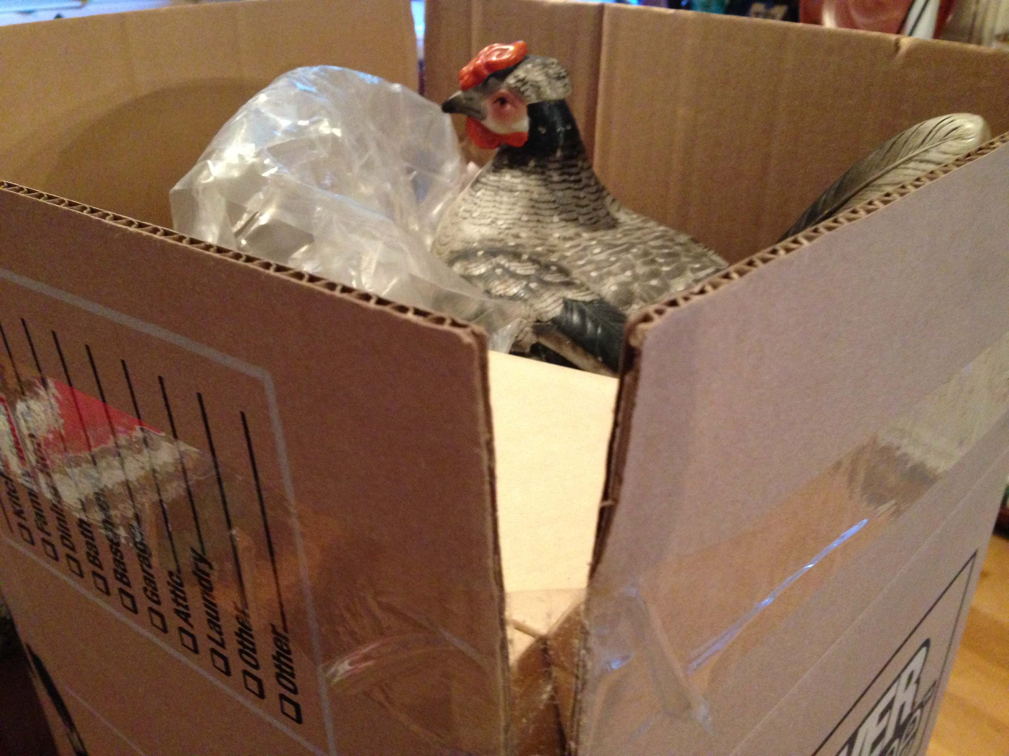 I put the hen on a basket and let it roost on top of our kitchen cabinet. She seems content there.