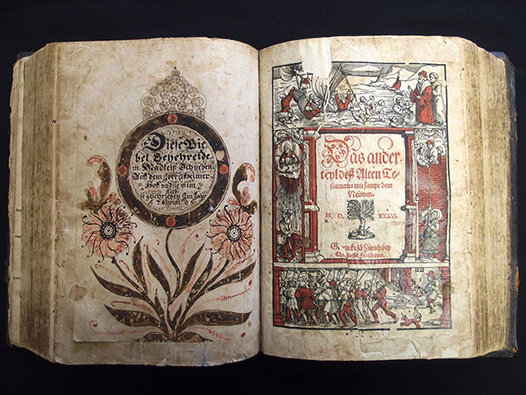 I was struck by an article in today’s Philadelphia Inquirer about an effort to preserve Pennsylvania’s top ten most endangered objects, “tangible pieces of Pennsylvania history.” The cost for the state to care for these items range from $1,665 for the earliest known free frank signed by George Washington; to $5,000 for Thaddeus Stevens’ wig; to $25,480 for preserving the visitors’ book for a jailed nineteenth-century abolitionist. Pictured is a 1536 illuminated Mennonite Froschauer Bible. The state “is launching a six-week ‘crowdsourcing’ effort to preserve them.”