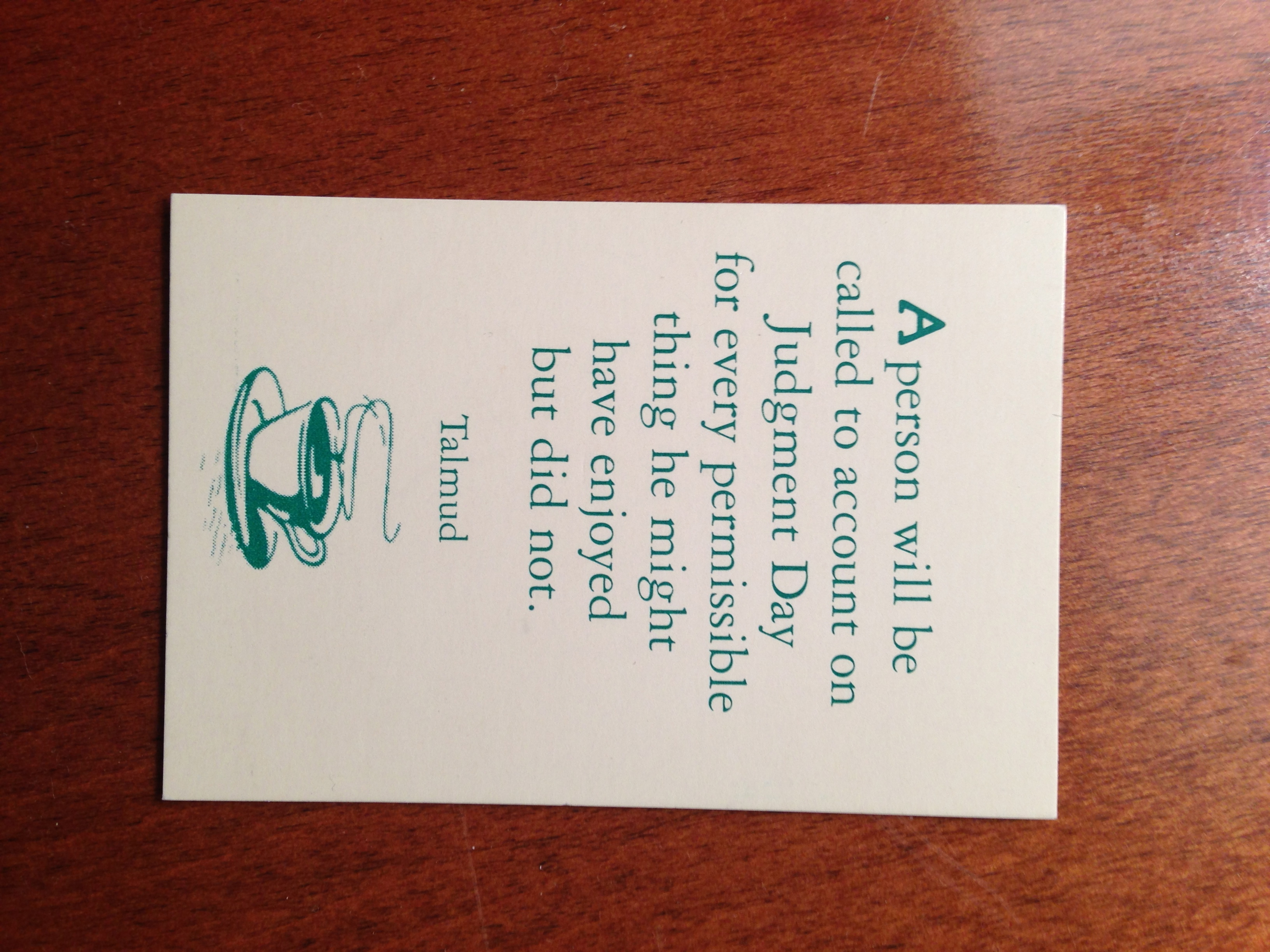 The question: “Why have I been depriving myself of this pleasure?” brought to mind a card I received from a friend who taught a Reiki class. She let us pick out and keep one tiny card from a small deck. This was the one I picked.