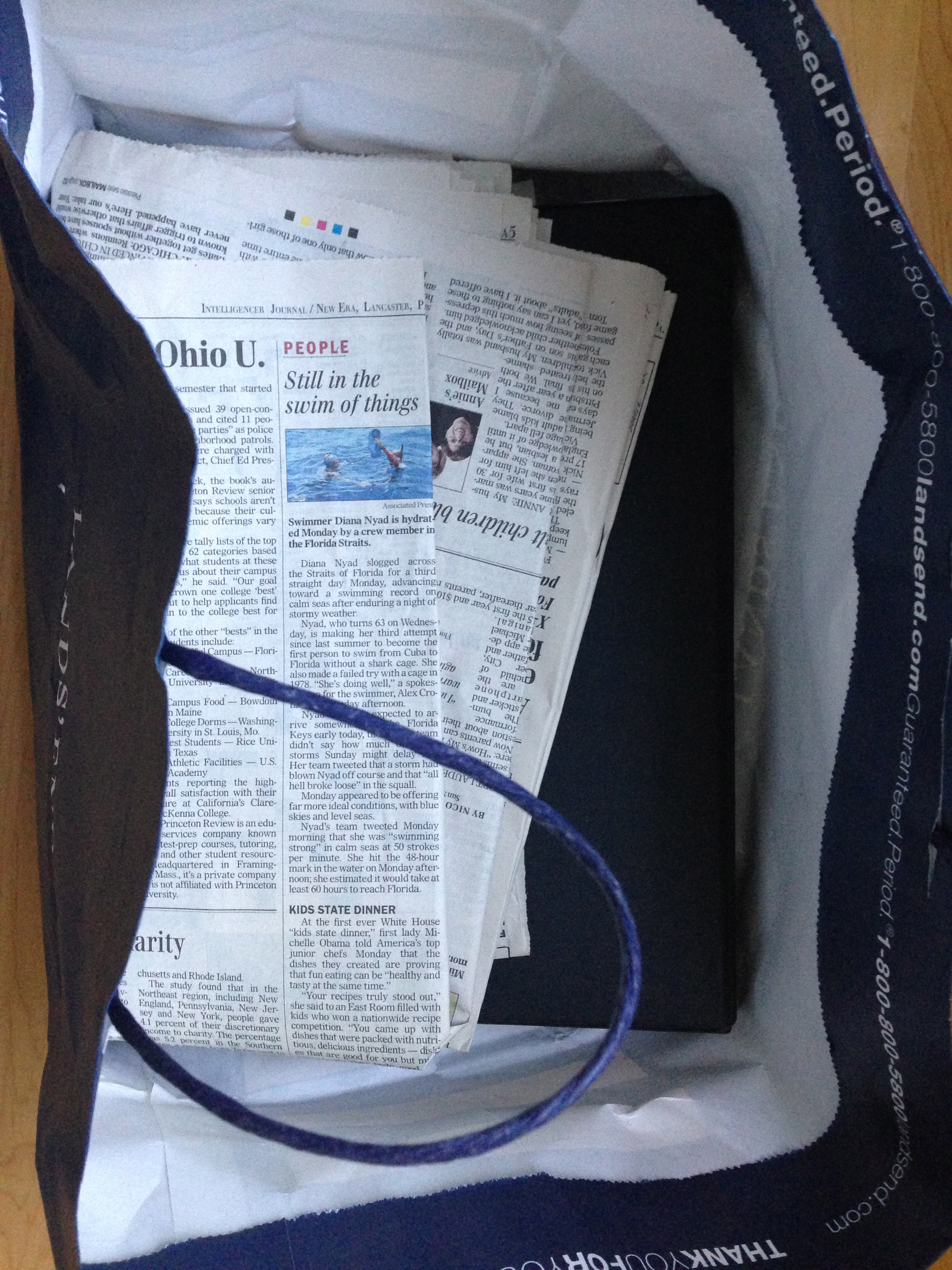 I thought this bag would contain my father’s obituary. Cue the dreading Duh-duh-duh music. It was actually a newspaper from the day he died. Not something to keep.