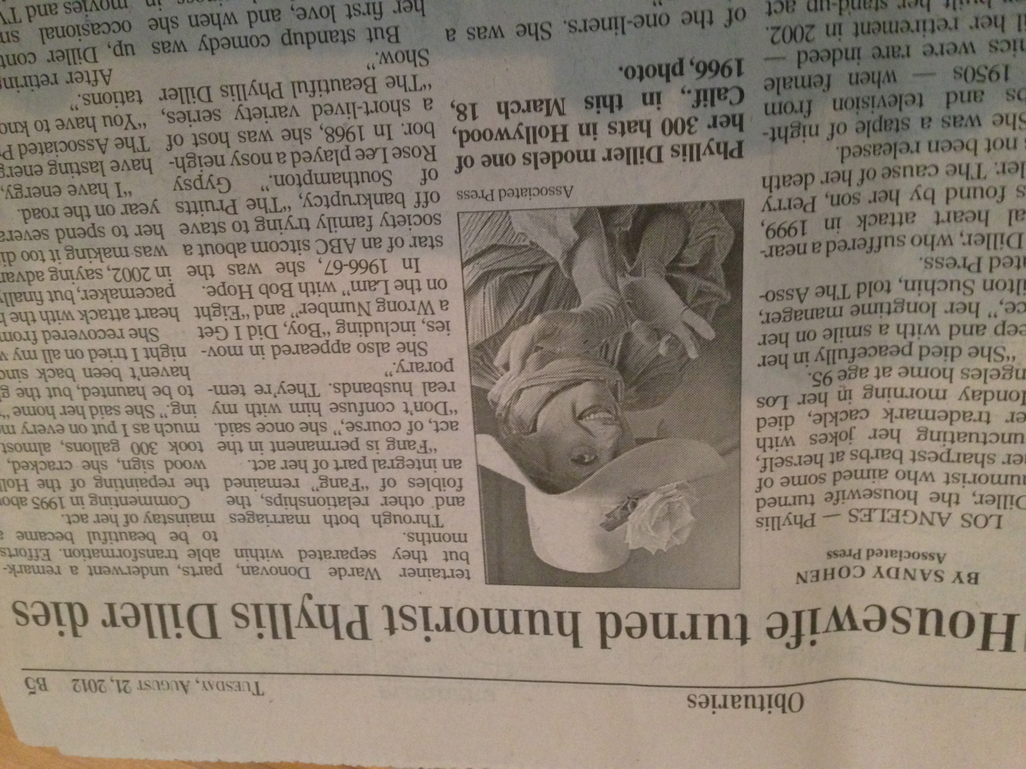 When scanning the obituaries in that day’s paper, I noticed Phyllis Diller had died around that time. Am I the only one who imagines the strange couplings of deceased souls arriving in the afterlife together? It pleases me to think of laughter around my dad.