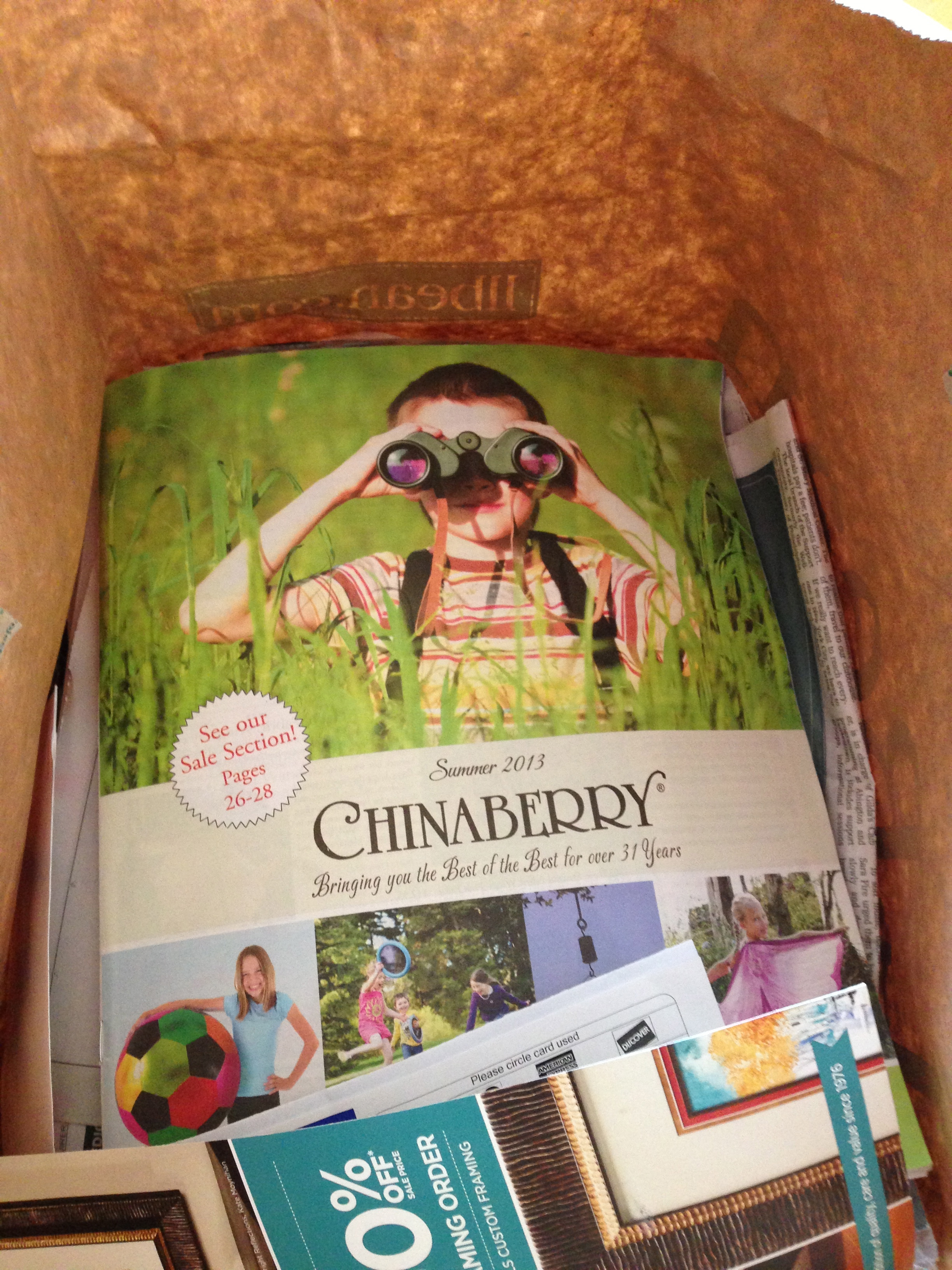 The little boy on the cover of one of my favorite catalogs (in the recycling bag) is urging me to continue this quest. I’m searching for a middle ground between abject messiness and sterile cleanliness. I can’t lose sight of the forest for the trees (papers).