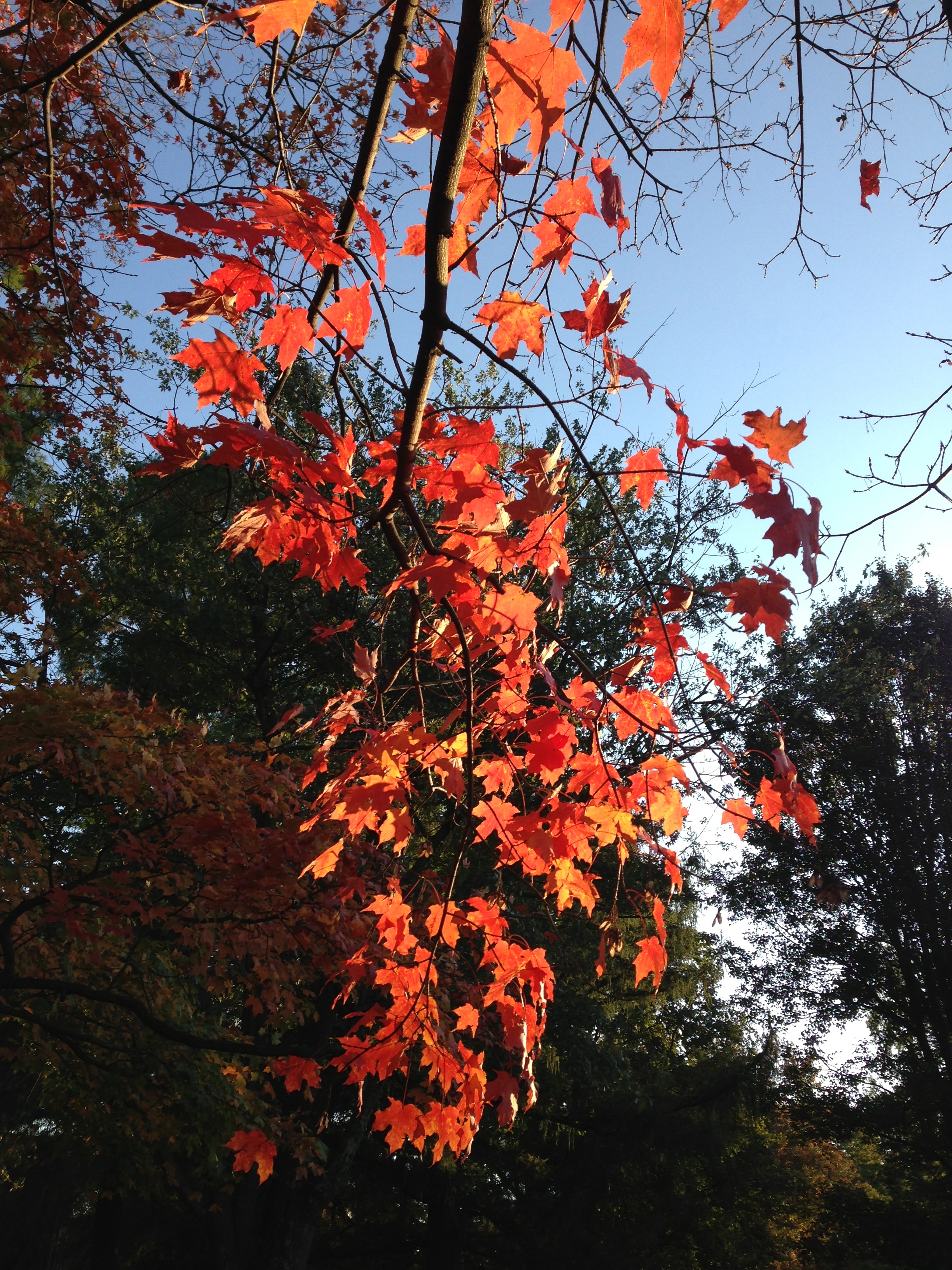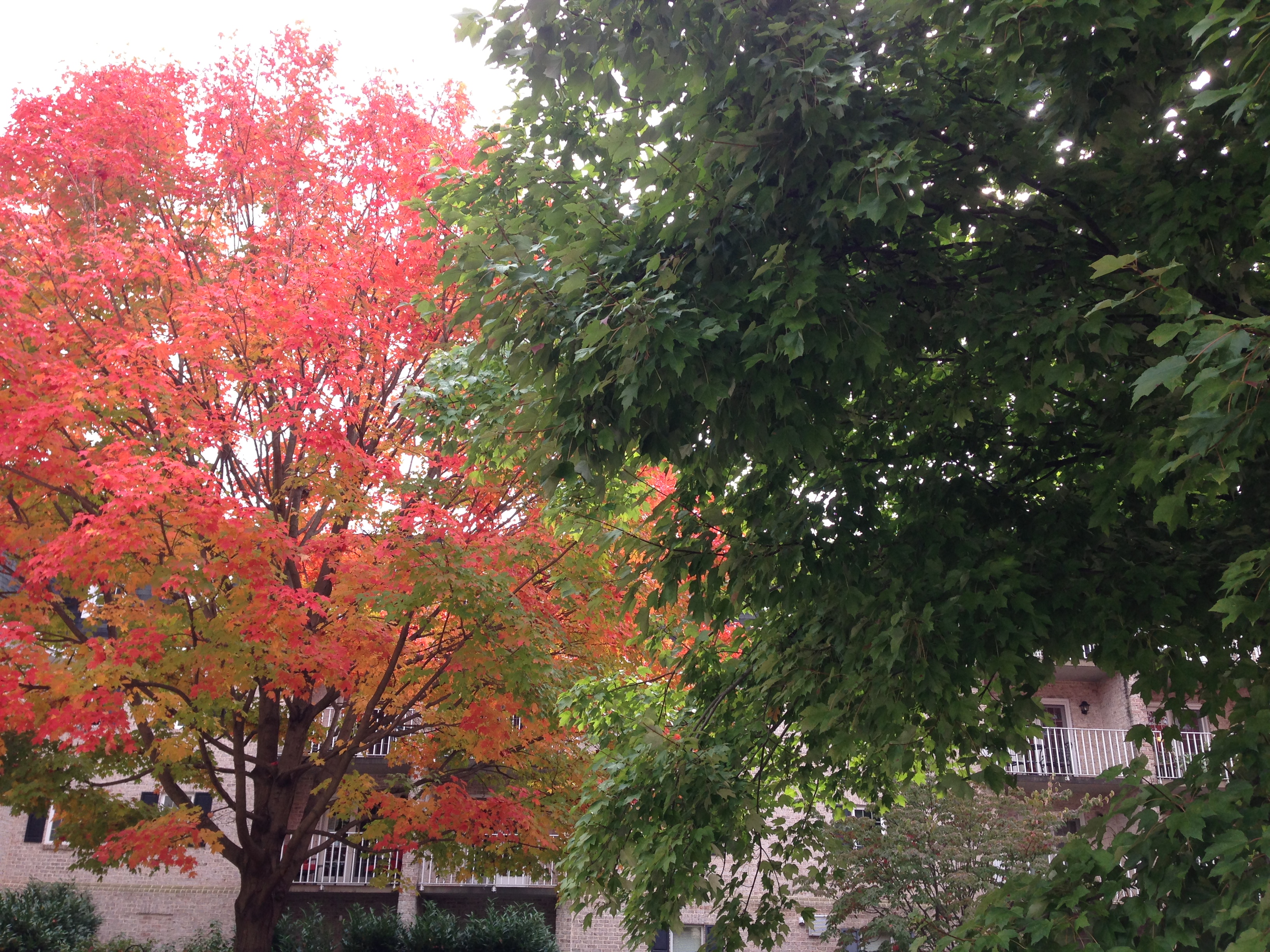 My mother and I sit outside and watch the changes in season with these two maple trees above us. We have been charting their progress and find it fascinating that the tree on the right was all leafed-out in the Spring, while the one on the left was barely budding. But now the left one seems to be winning the race.