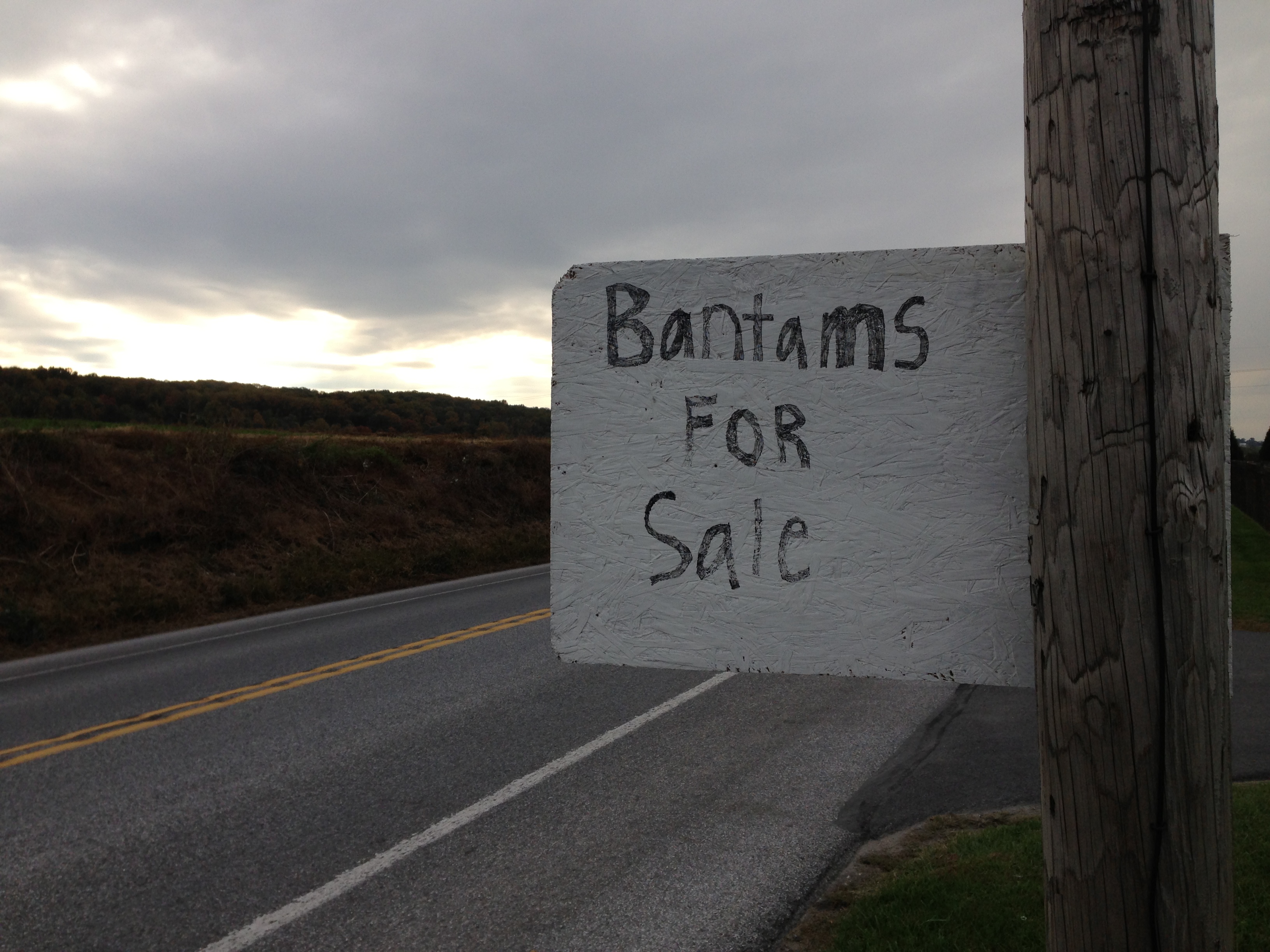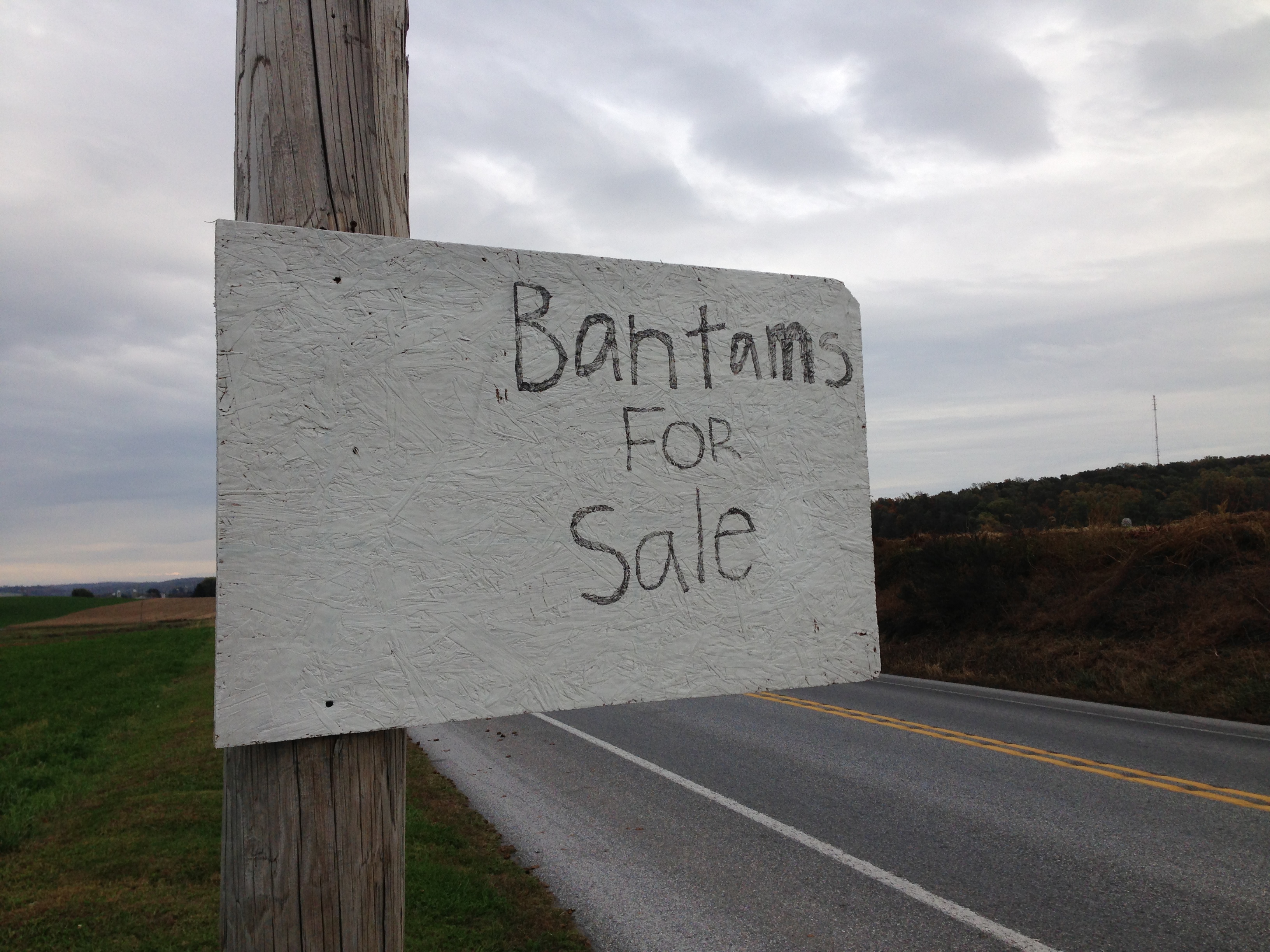 Just yesterday I had stopped to take a picture of a sign I enjoy seeing on my way to and from visiting my mom in Lancaster County, PA. I know I’m in farm country when the roadside advertisement is for Bantams.