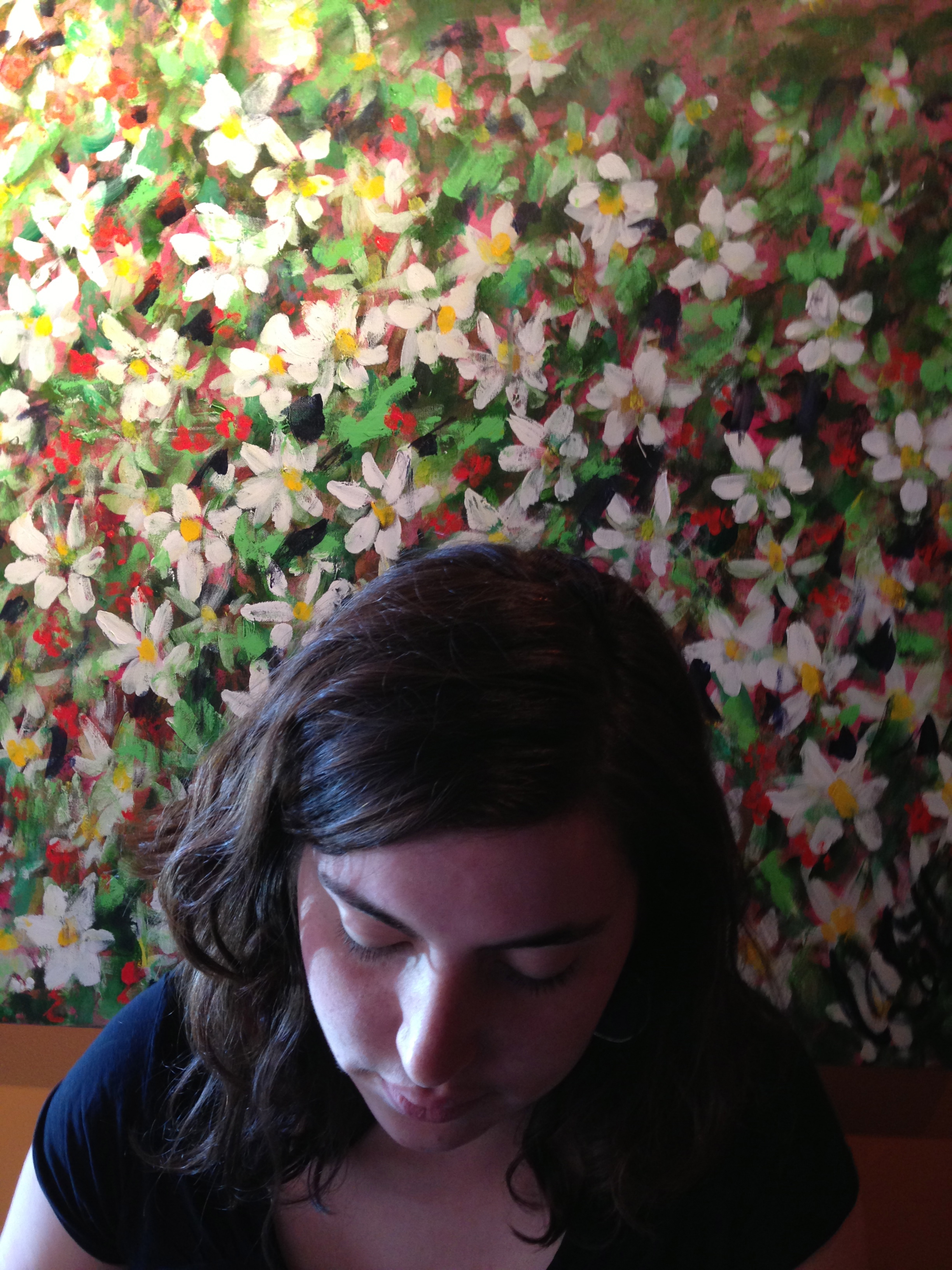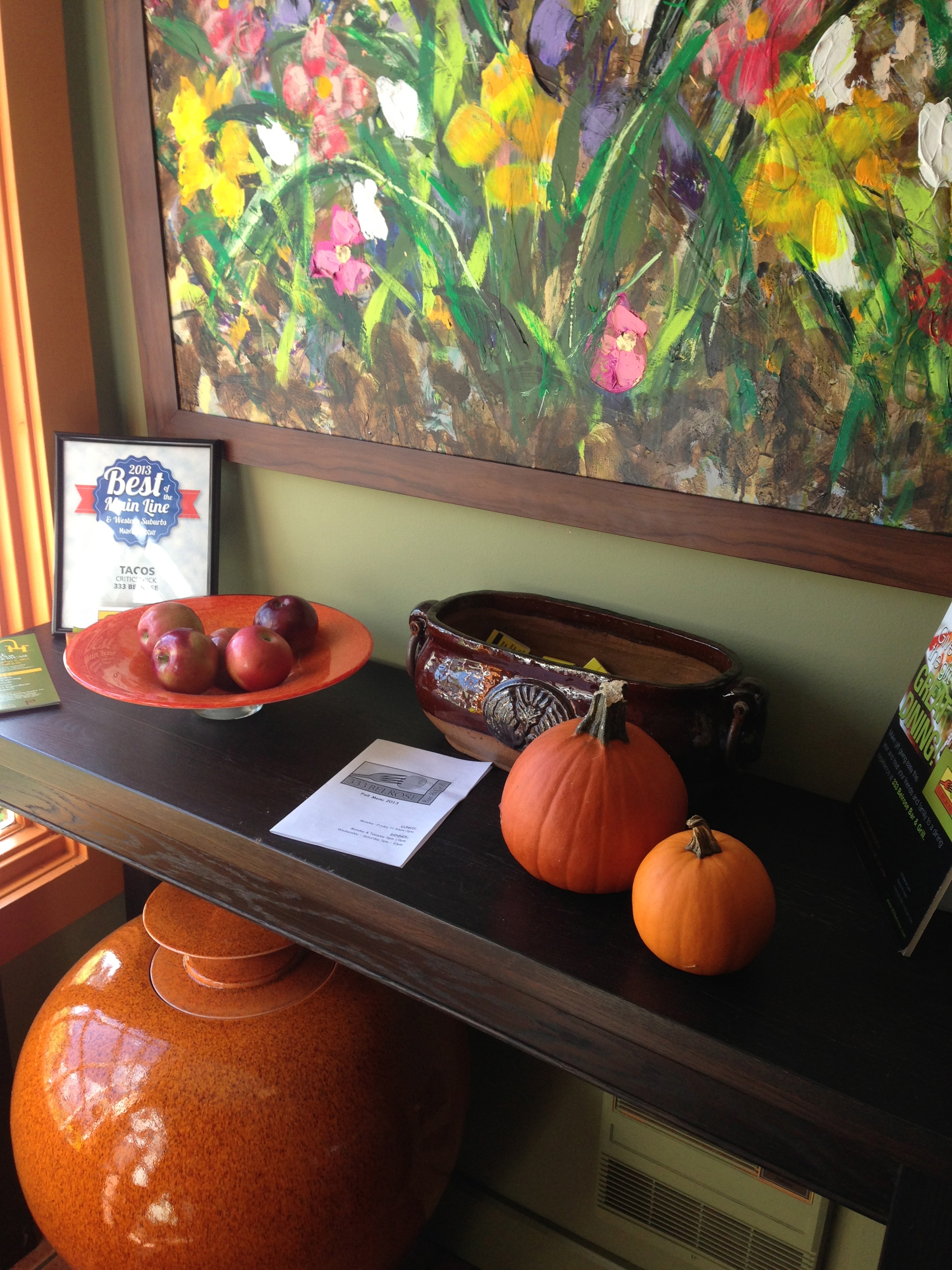 I had the delightful job of bringing a clump of things to my college student daughter and taking her out to lunch today. The restaurant was decorated with beautiful, energizing paintings of flowers. I loved this fall display with the pumpkin-like urn on the floor.