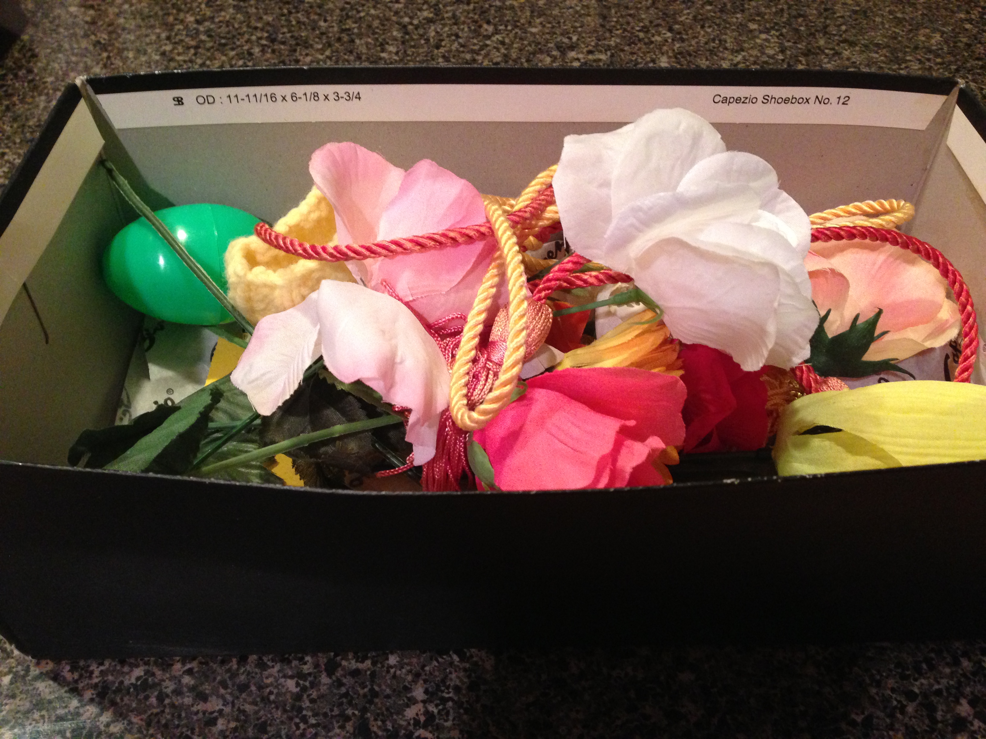 But then it was back home to make another little dent in the shoe-pile remains: a shoebox that somehow became the repository of a strange assortment of objects. More flowers: these were from a past theater experience involving our older daughter. They will adorn the next Goodwill donation pile.