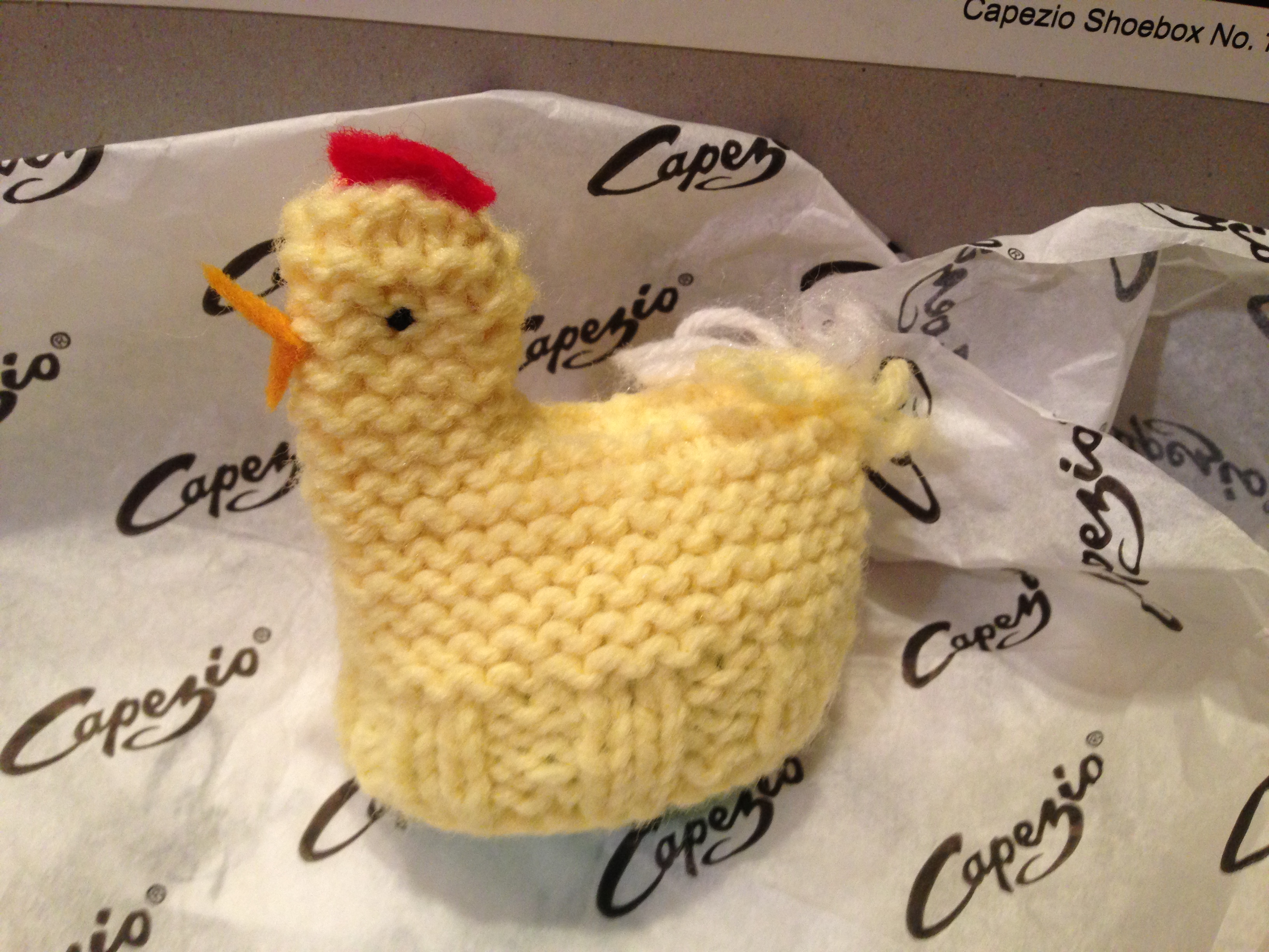 This chicken was hand-knit by the dear second wife of my husband’s father. It sits on a green plastic egg. Must keep. I put it away with other Easter stuff, to be enjoyed for years to come.