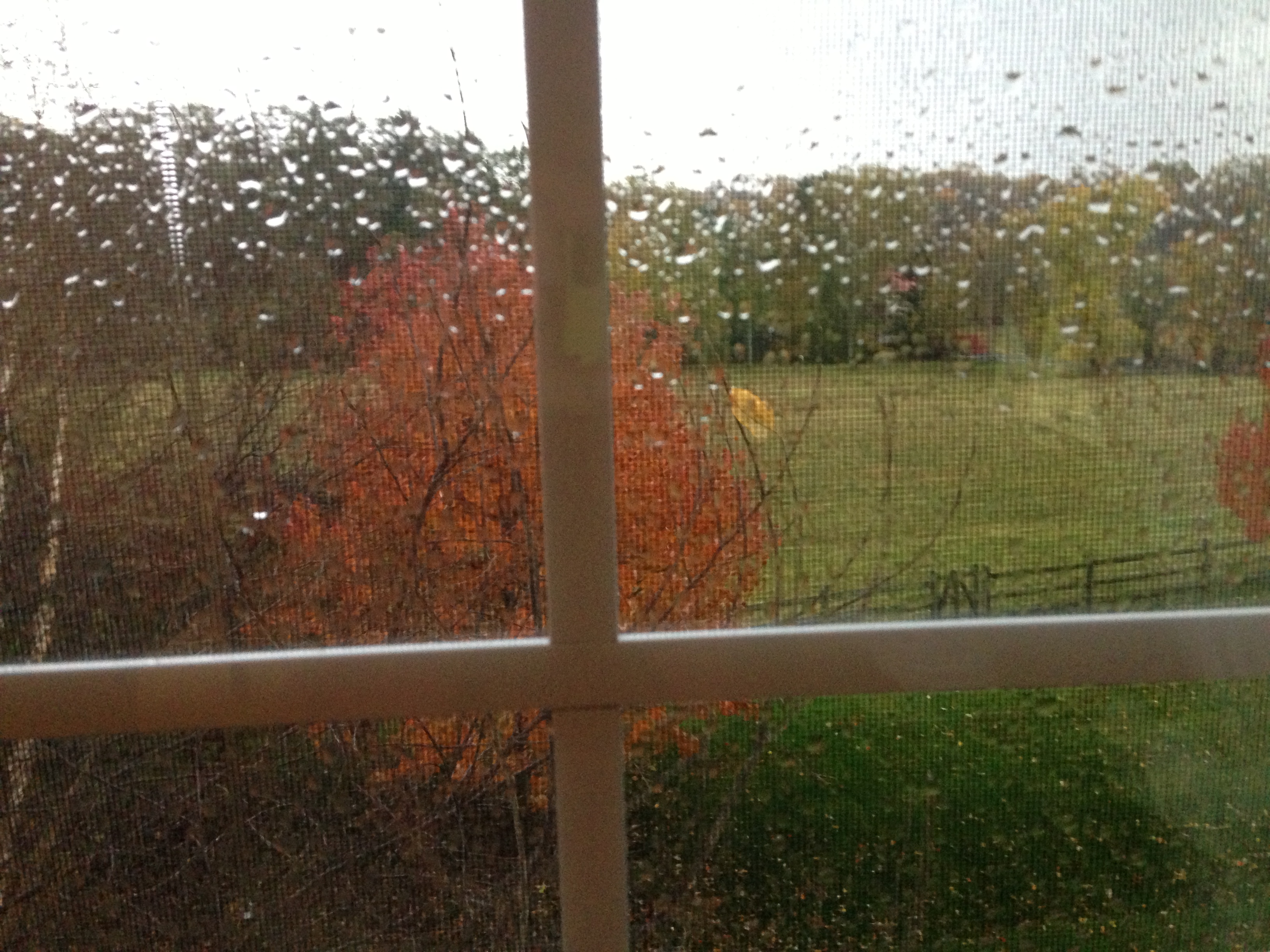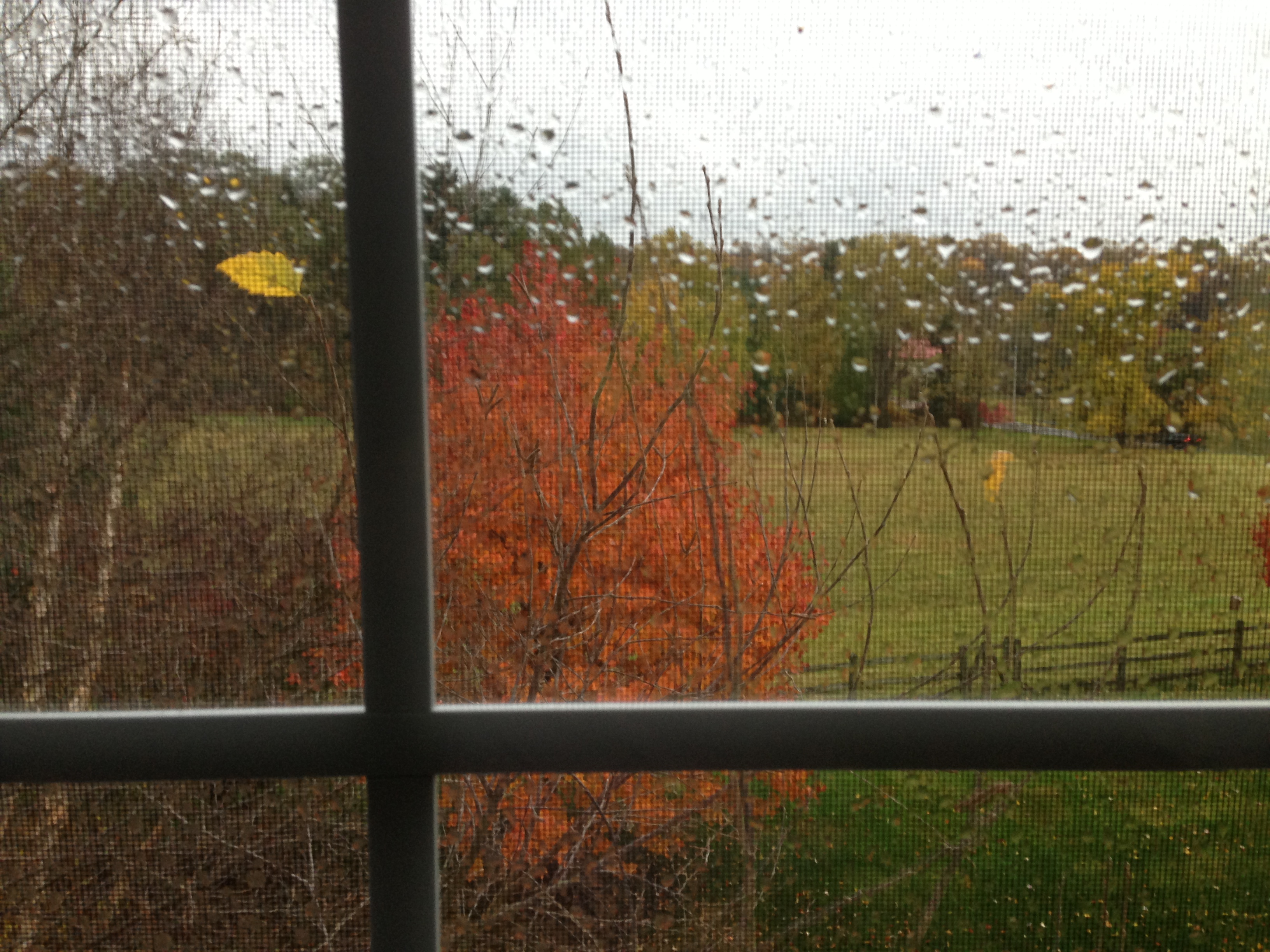 I thought the leaf would be a goner, but it held on and the sky cleared (at this point I took down the screen and opened the window to snap the photo):