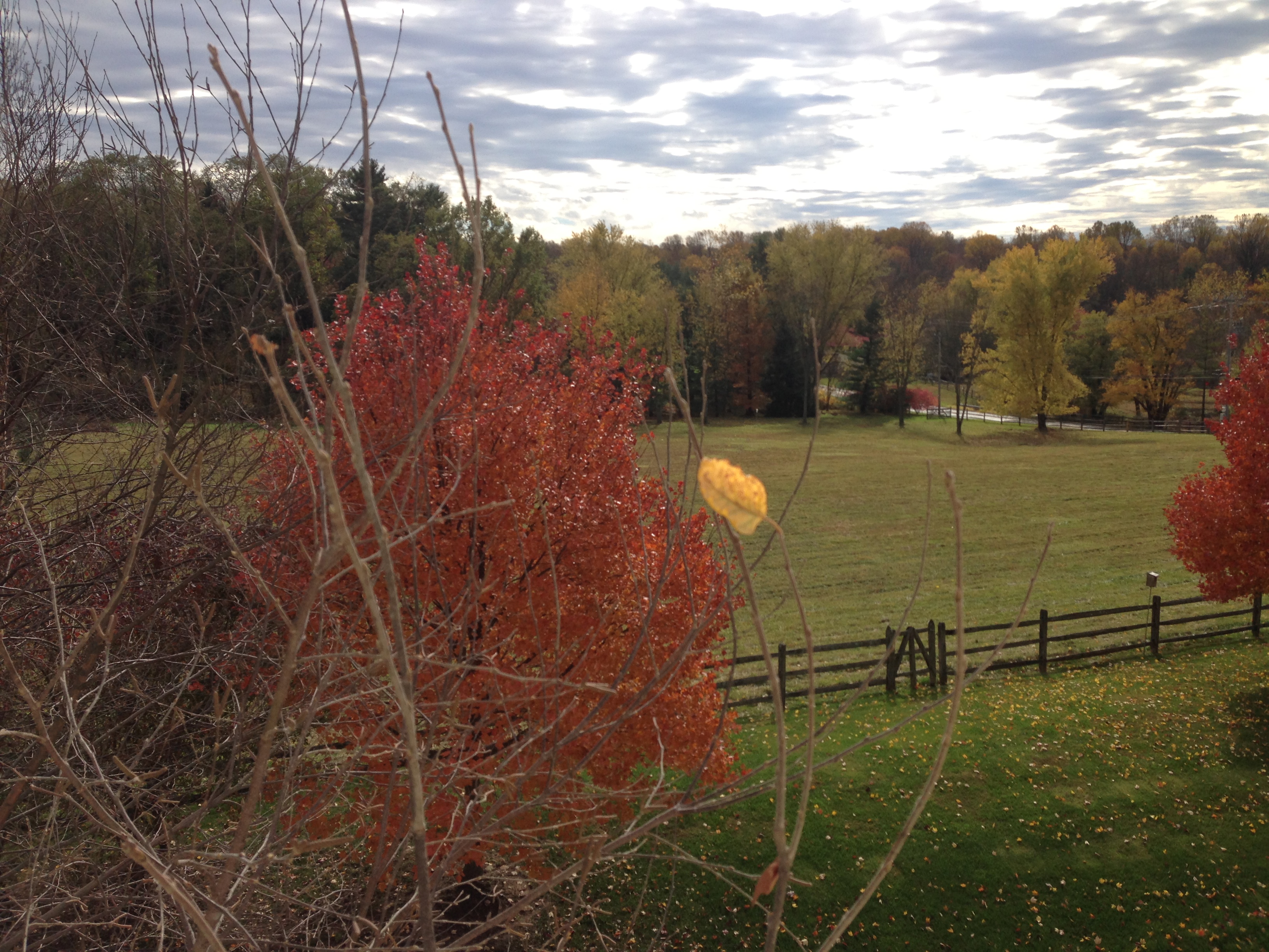Last Friday I noticed that the leaves outside the window, which had been green and in abundance not long ago, had all turned yellow and fallen, except two: