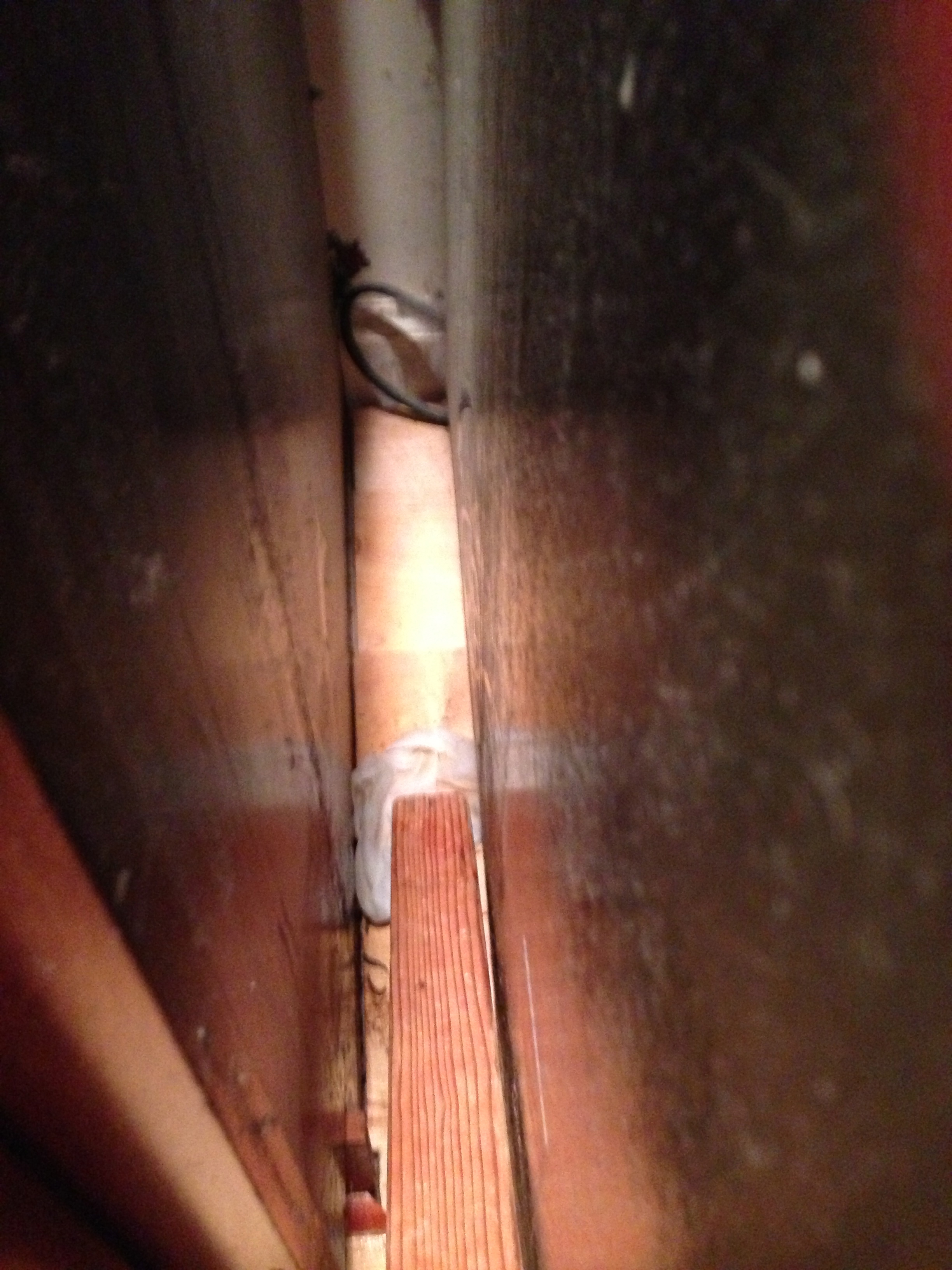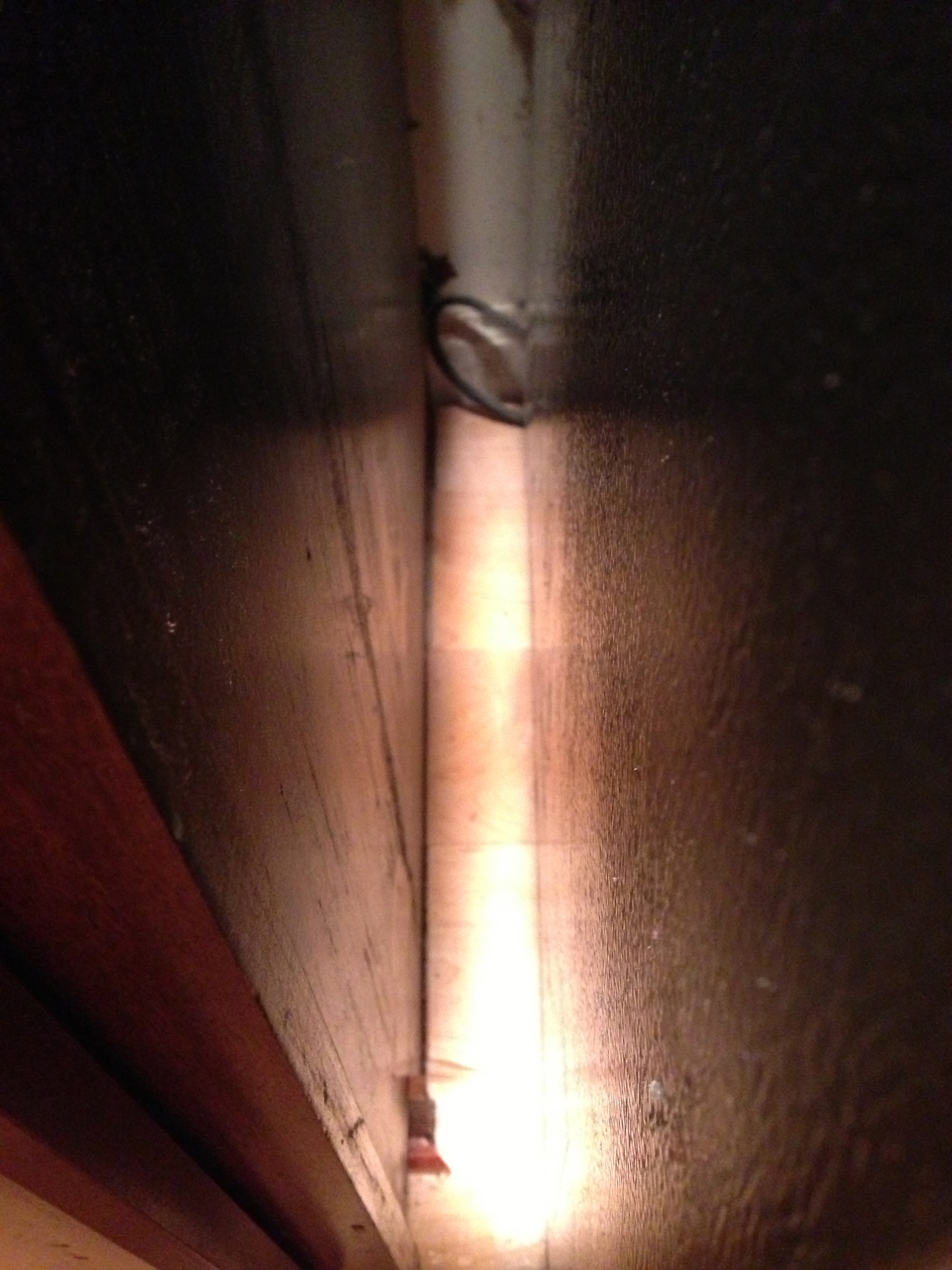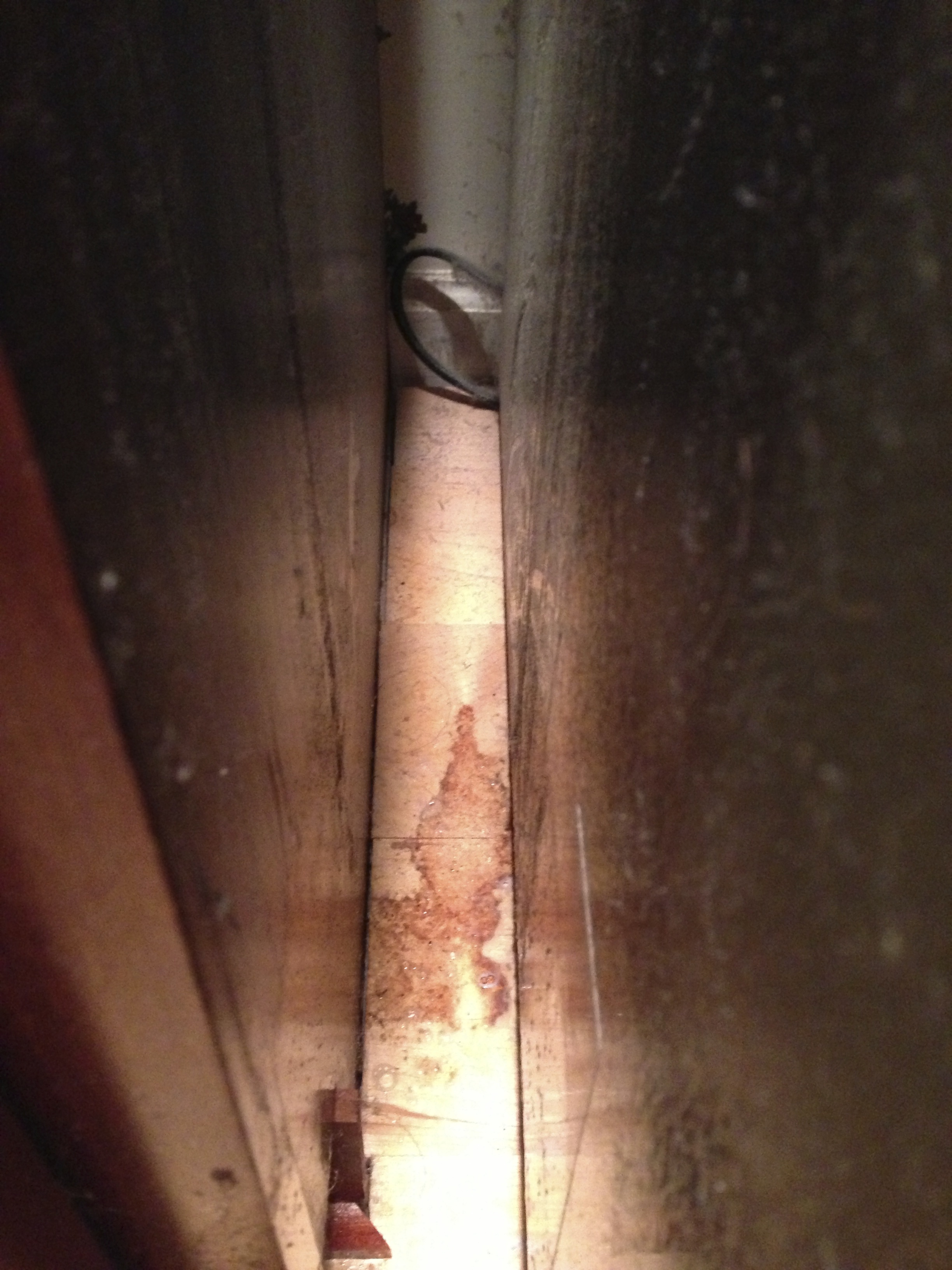 Much worse was this awful one on the floor between the kitchen cabinet and refrigerator.  I’d always thought it was a wood stain spill left by a careless worker who thought it would be hidden.  But in cleaning a spot on the bottom of the stain, I realized the whole thing was coming off!