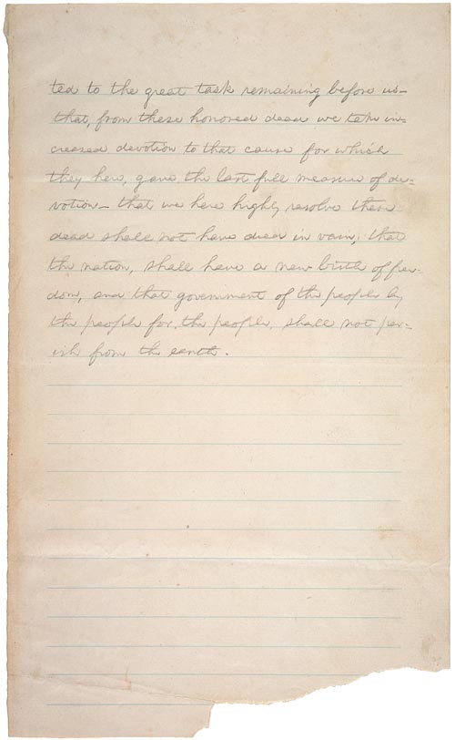 The world will little note, nor long remember what we say here, but it can never forget what they did here. It is for us the living, rather, to be dedicated here to the unfinished work which they who fought here have thus far so nobly advanced. It is rather for us to be here dedicated to the great task remaining before us — that from these honored dead we take increased devotion to that cause for which they gave the last full measure of devotion — that we here highly resolve that these dead shall not have died in vain — that this nation, under God, shall have a new birth of freedom — and that government of the people, by the people, for the people, shall not perish from the earth.