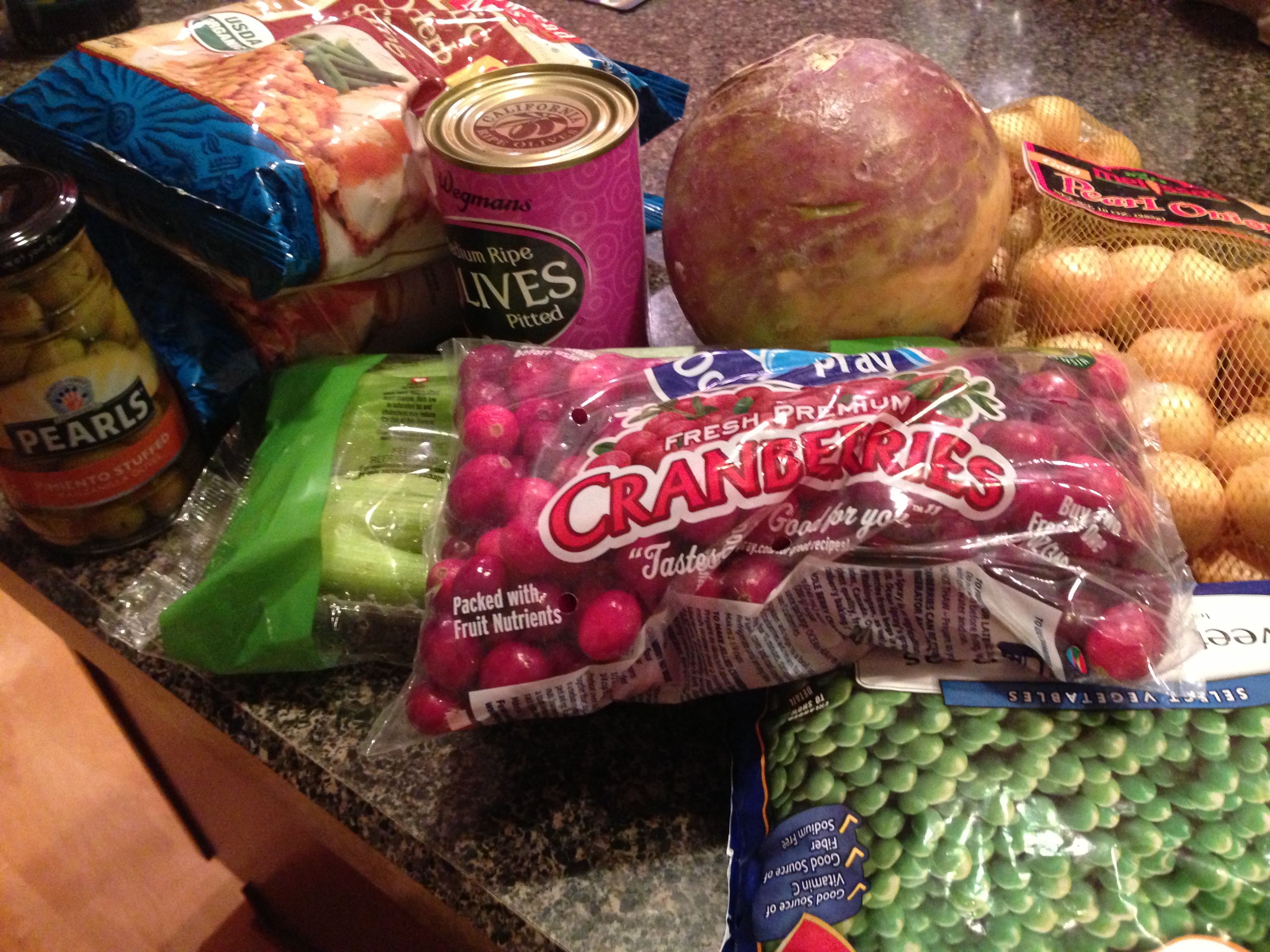 The elements of our traditional Thanksgiving meal come from the supermarket.  Growing up, we would refer to “the turnips” that were always on our holiday table.  Only after I was old enough to participate in the shopping for, and cooking of, the meal did I learn from my mom it’s actually a rutabaga we use to make “turnips.”  The other family traditions are: a plate with carrot and celery sticks and black and green olives, turkey, dressing, mashed potatoes, my older sister’s creamed onions (with her “secret ingredient”), peas, gravy, rolls, and cranberry sauce.  I’m starting to get exhausted thinking about it.  But getting the shopping done early is a relief.  I don’t have to worry that the store will run out of cranberries, or fight off the hordes for a turkey.