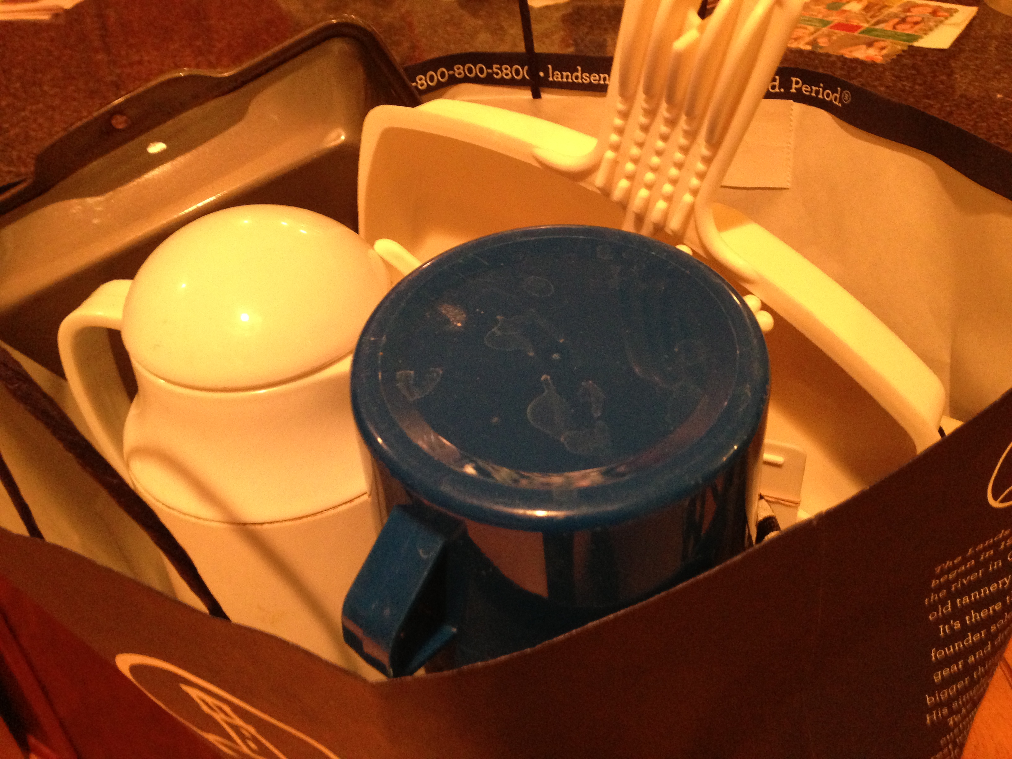 A clump like yesterday’s out-of-control cabinet consists of two phases. First, clearing and sorting into keep, throw away, and give-away piles. Then, getting the give-aways out of the house.  All the items pictured below are now at the Goodwill, and with any luck, will be of good use to someone else.