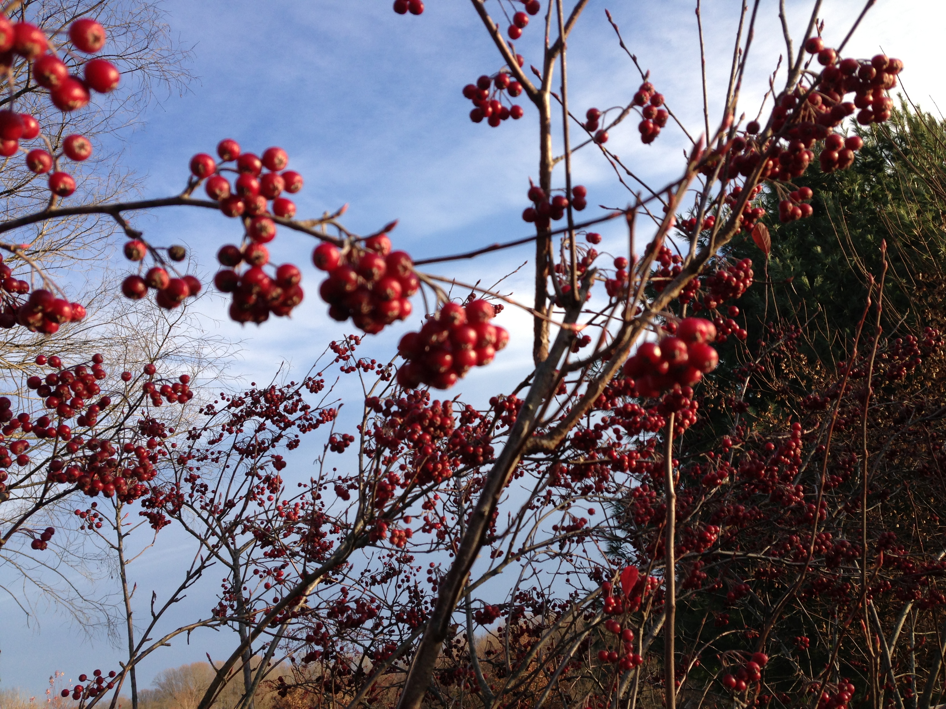 Feeling a bit color-starved when outdoors, I’ve been appreciating berries: one of the last swatches of bright color in the landscape. The other day I was thinking about the fact that I’m like a bird seeking out color, when a bright red cardinal flew right in front of me.