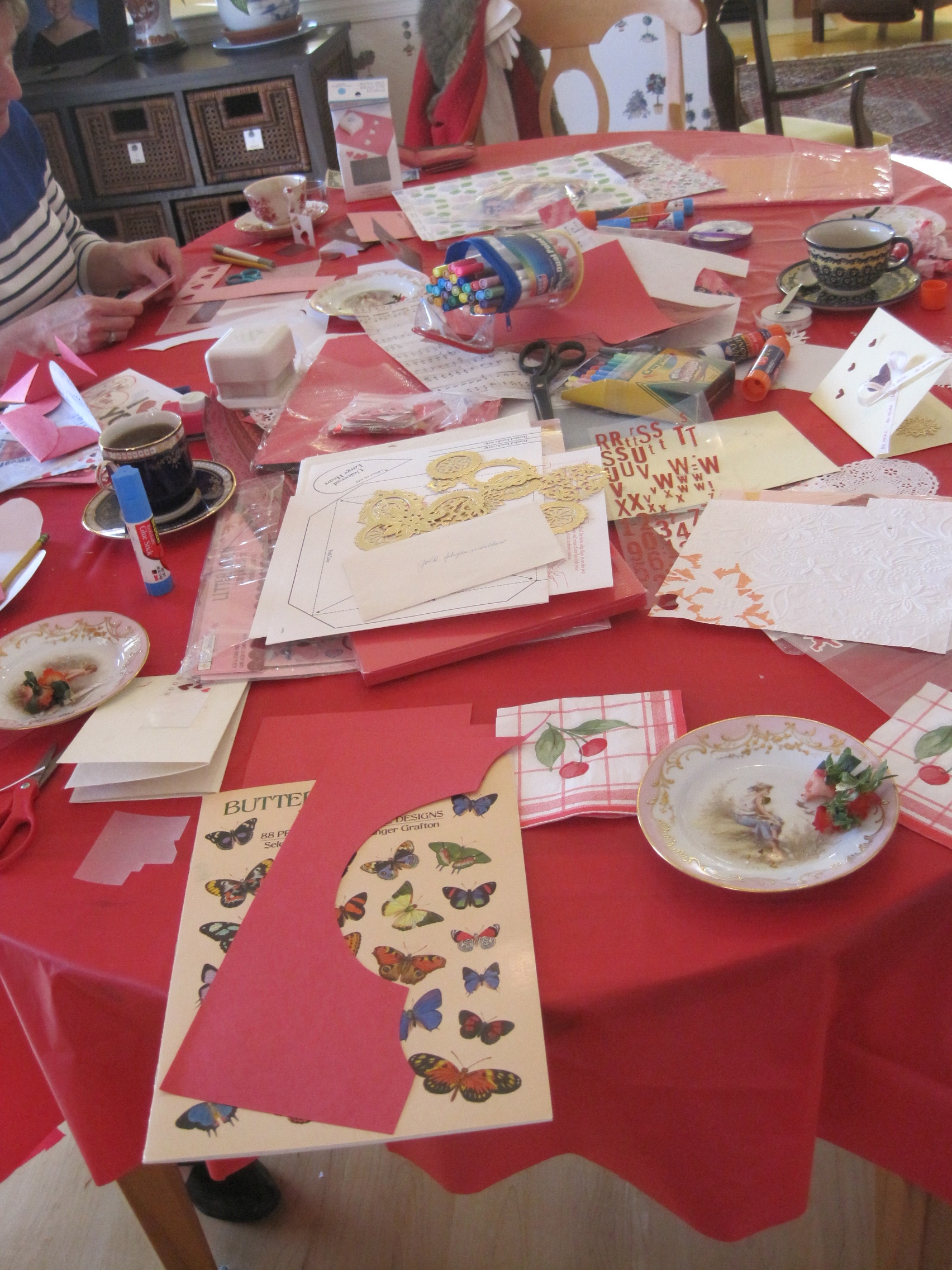 Happily, a few die-hard friends did arrive for tea, strawberries, sweets, and valentine-making.  One guest wore a fancy red coat and white gloves!