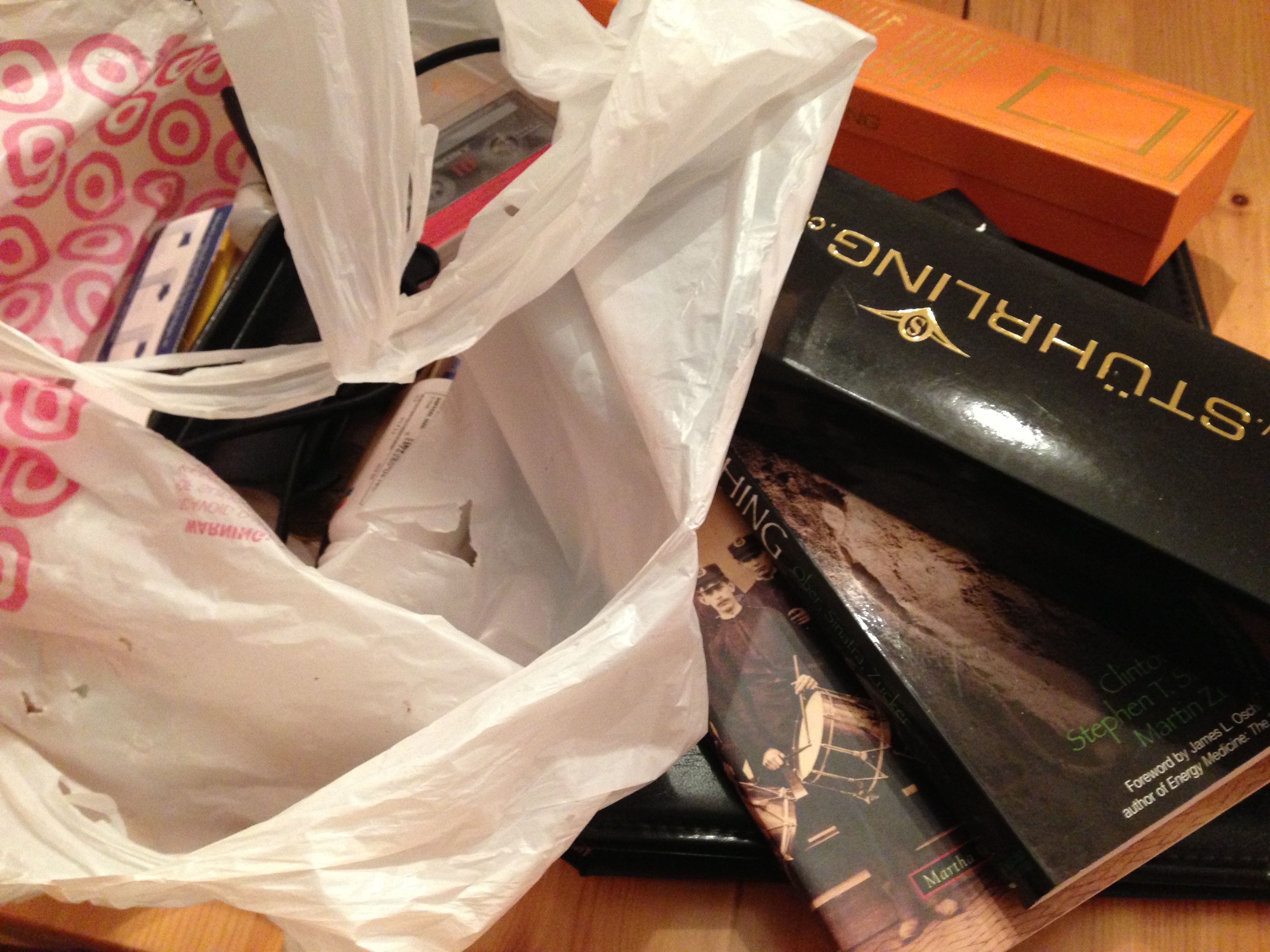 For the life of me, I can’t remember when, why or how this bag of random junk got stashed together.  A mystery for the ages. But today I broke it down into things I can do: toss out, give away, or, in at least three cases, return to someone else.  I enlisted my husband’s help and we puzzled over the pile together.