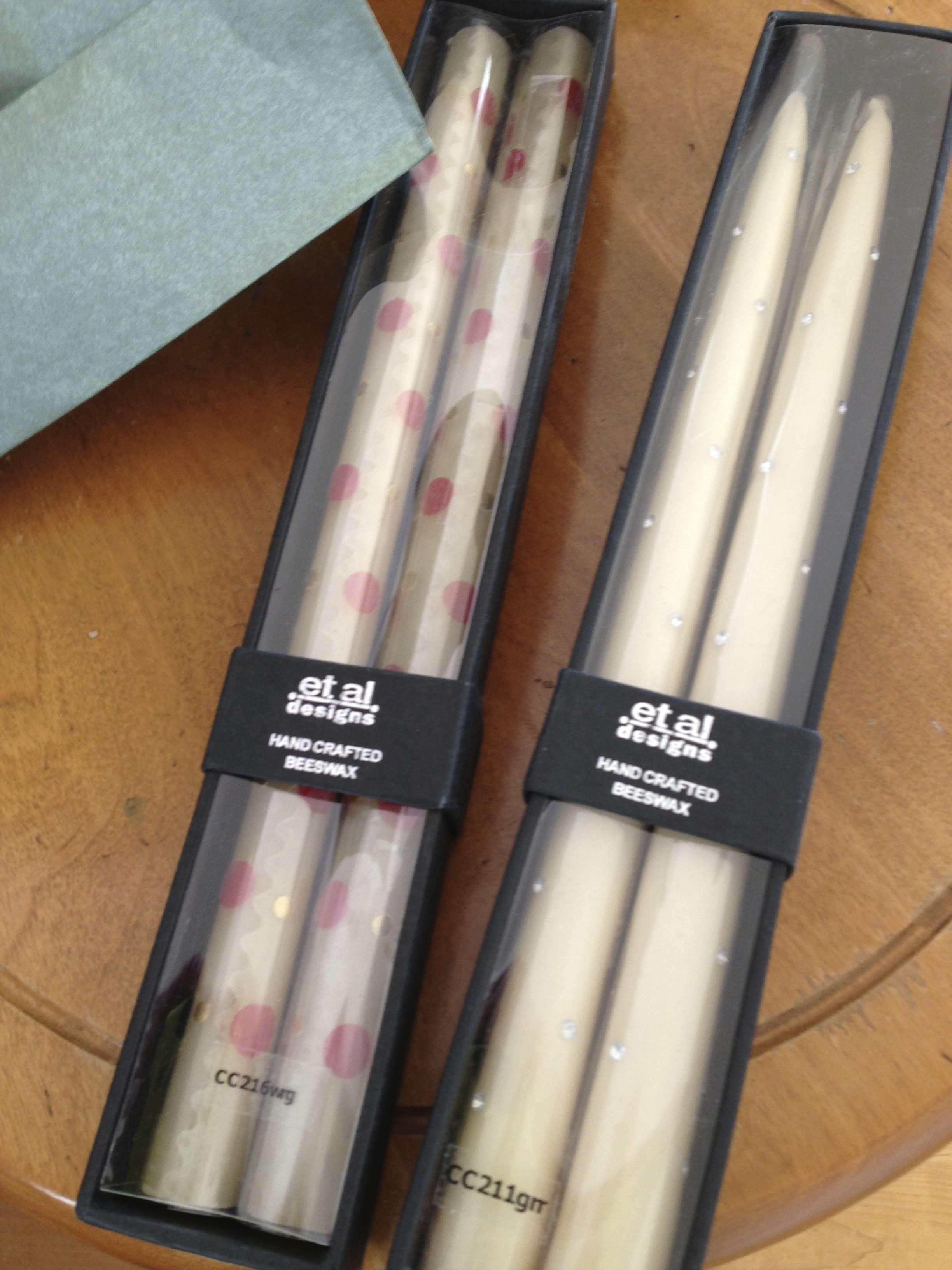 I had bought these candles, below, at a holiday open house in November.  The lady who sold them to me said she bought them for everyone she knew last Christmas.  Something special that someone might not buy for themselves and can be used up, not adding too much to the gift recipient’s clutter.  The beeswax candles on the left made someone very happy today, which made me happy.  Getting to the good part!