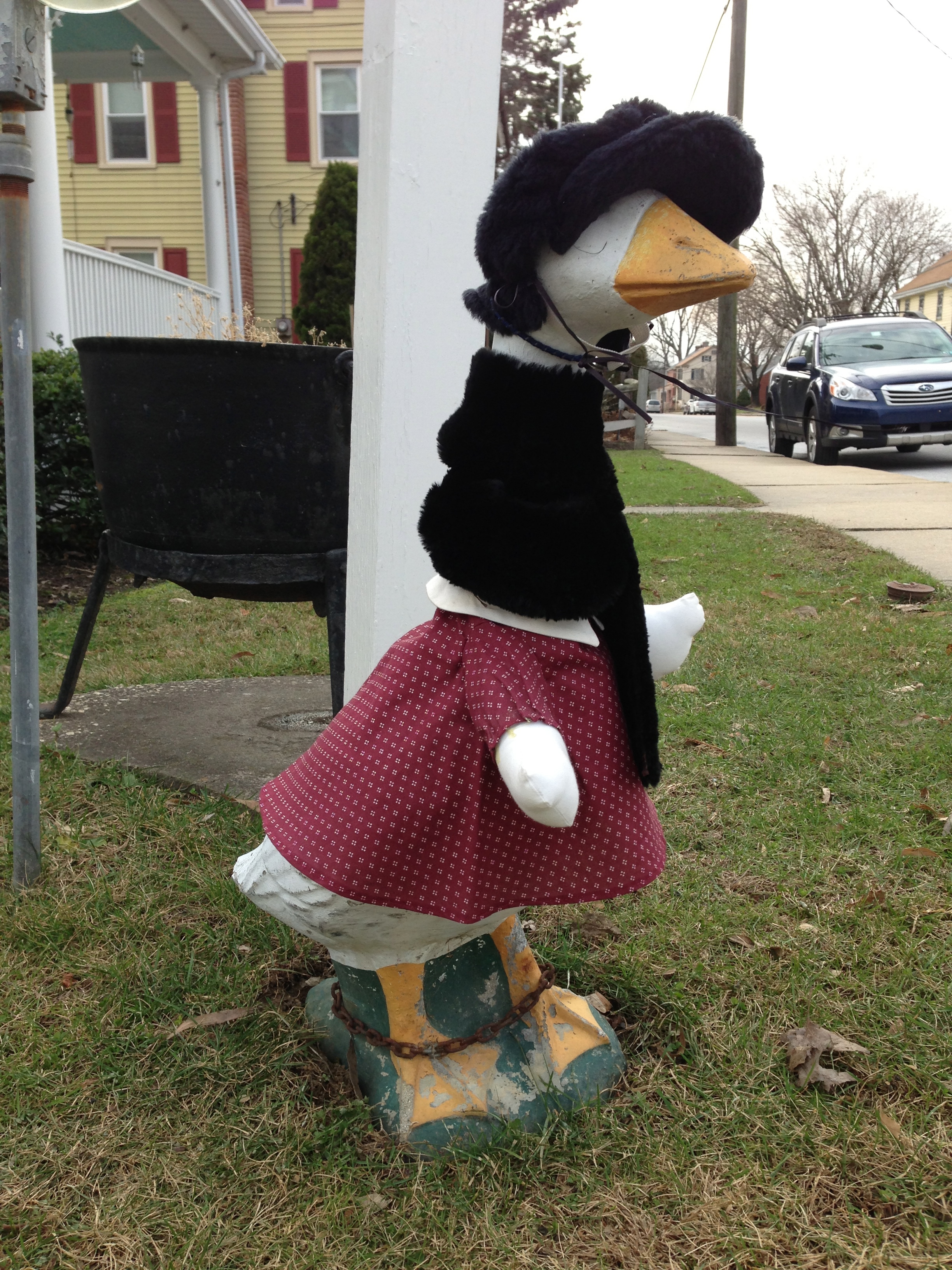 In other news, the most fashionable goose in Strasburg, PA was bundled up for the storm. Possibly the first piece in the avian couture line to have arms/hands/wing tips?