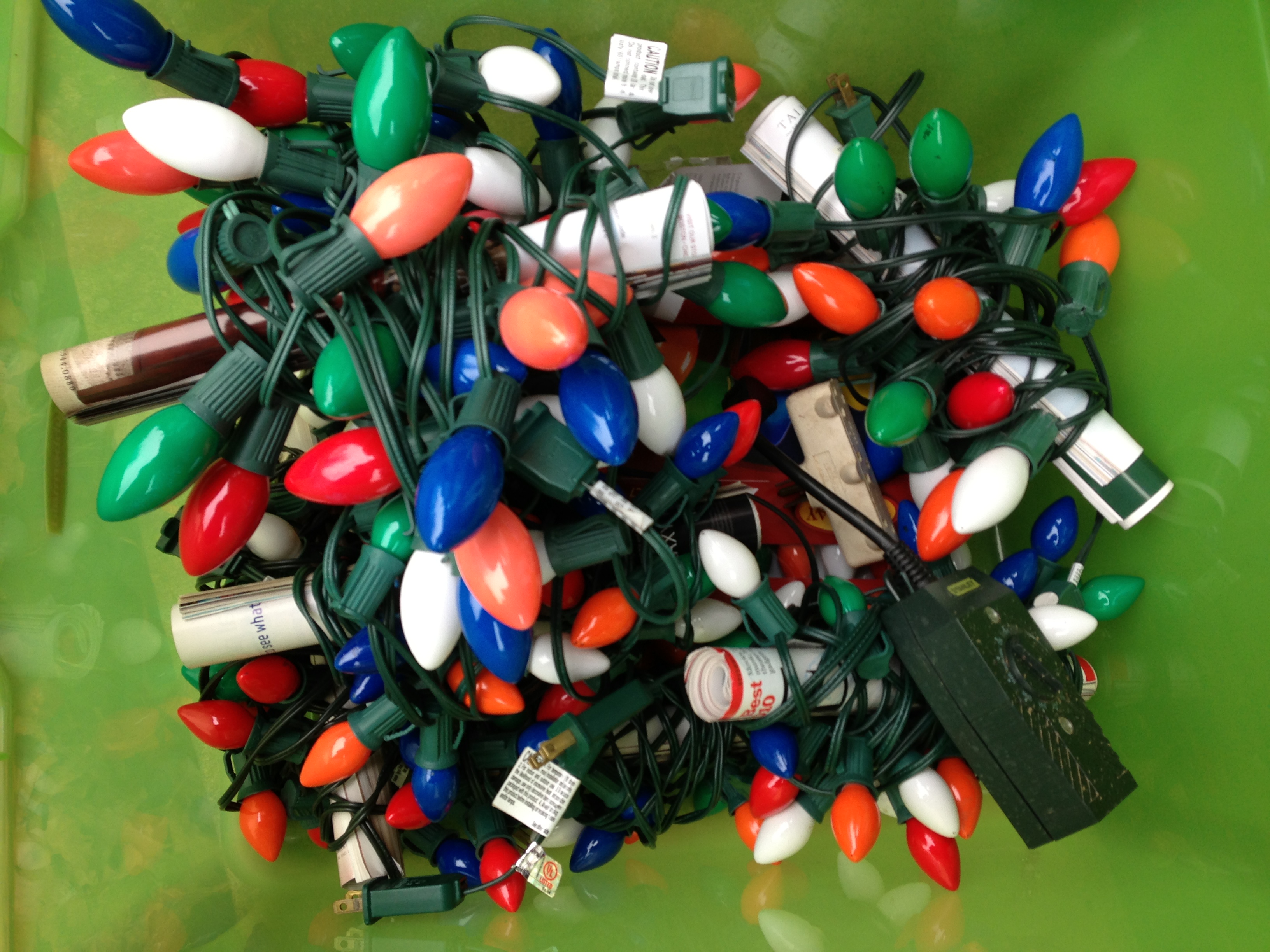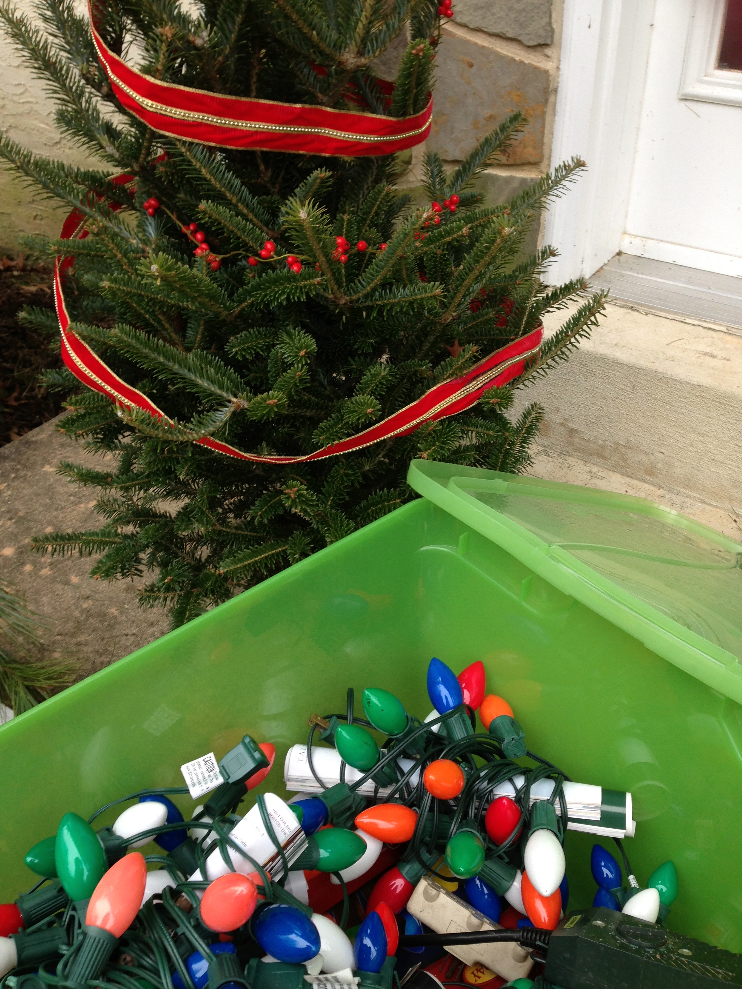 We wrap the strings of lights on rolled-up magazines or catalogs. The timer (lower right) and three-pronged plug are thrown in the same box. I can’t tell you how many times those things have gotten separated from the lights … enough to drive a person crazy! A big success in a tiny little action.
