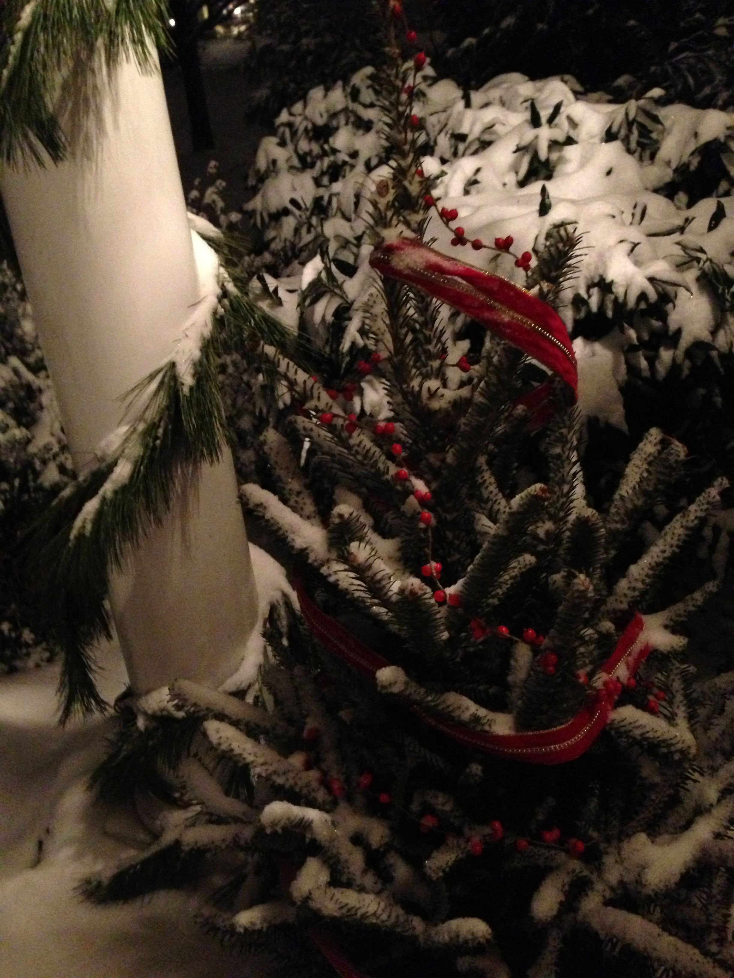 And here it is just minutes ago, naturally decorated with the promised snow (we planned ahead! we did it!):