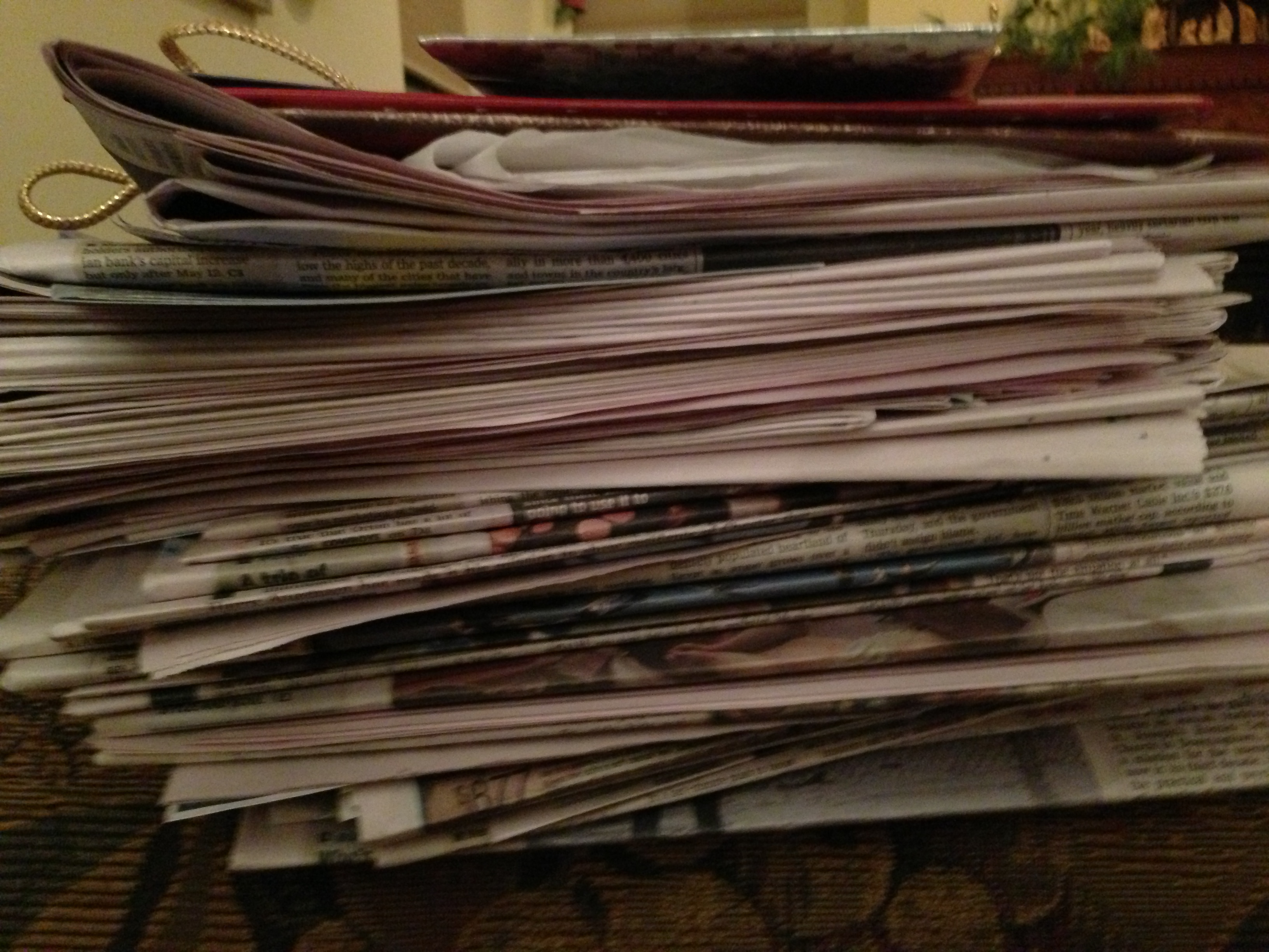 In the rush, rush, crush of the holidays I didn’t have time for reading the newspaper, something I’m normally addicted to.  So going through this pile quickly was difficult.  I couldn’t peruse each section the way I normally do, but off they go into the recycling.  Here’s the thing: news should be new.