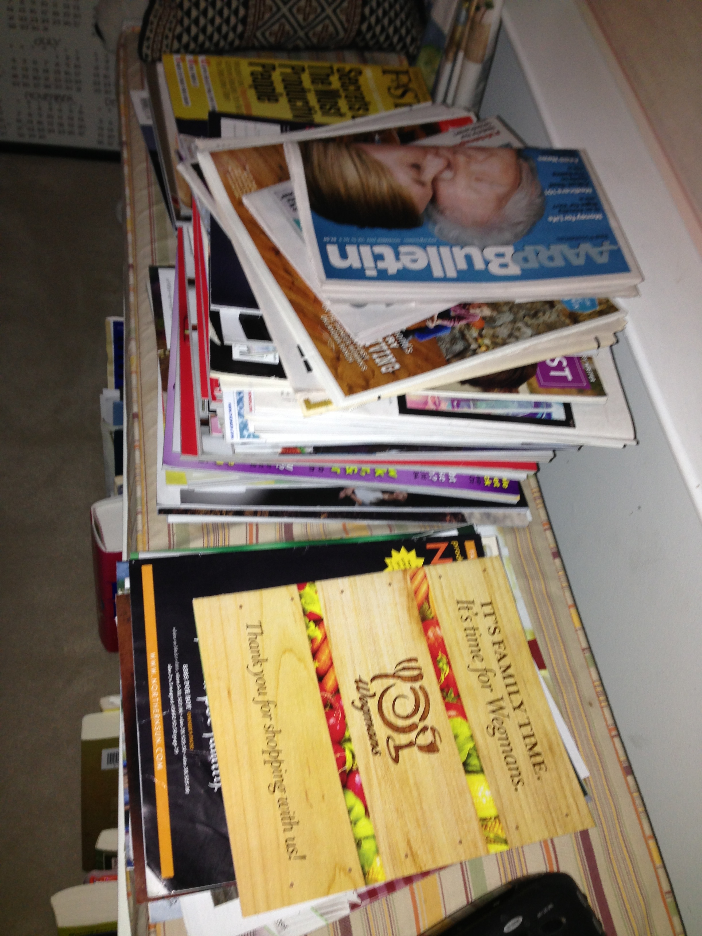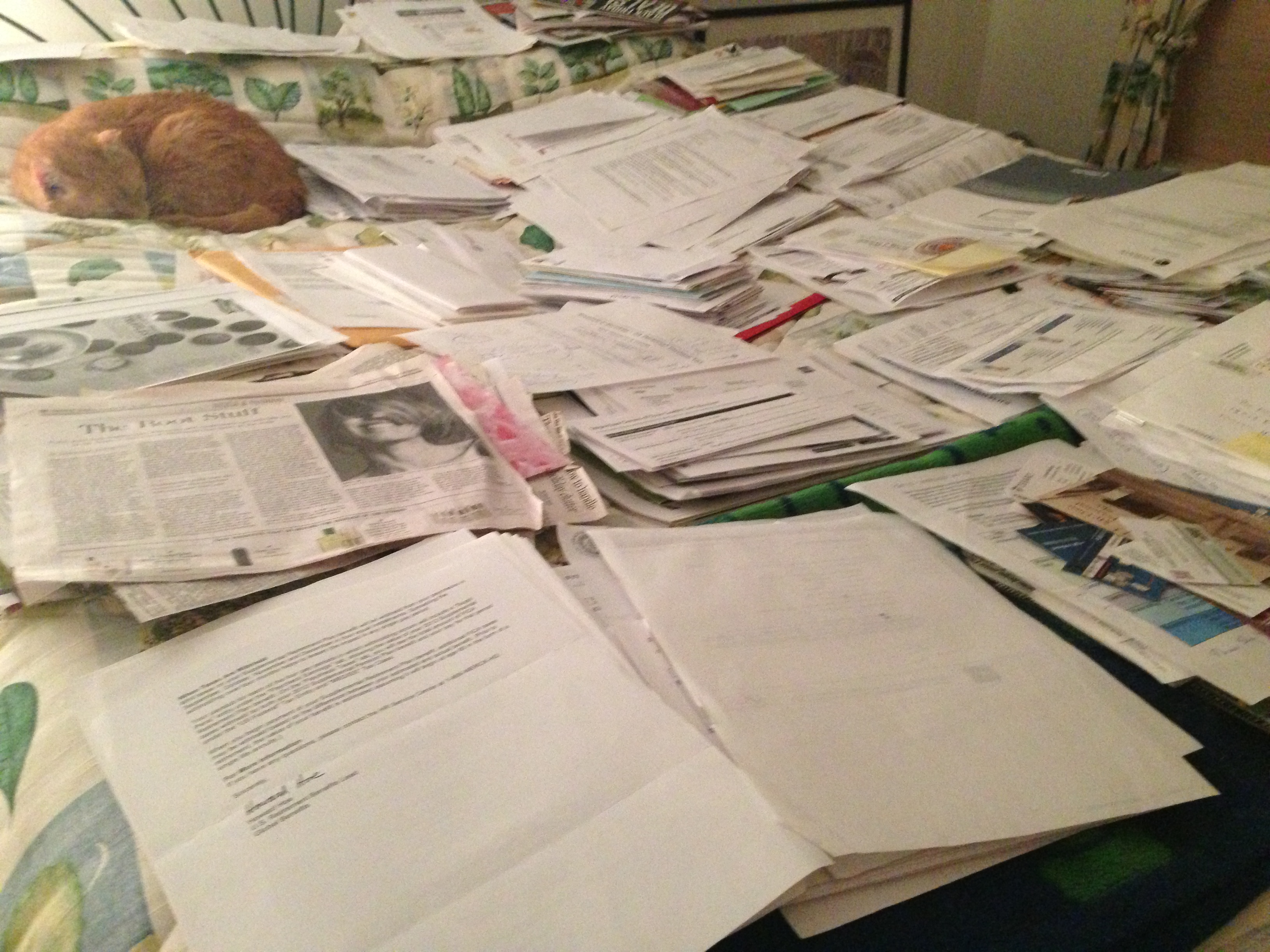 I came home after a long day today to an amazing surprise. My younger daughter had taken all of the paper in my anxiety closet and had sorted it out into logical categories. Magazines; recipes; newspapers; charitable donations; coupons; etc.; etc. Our cat, Pumpkin, was all tired out just watching her: